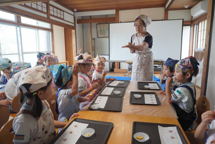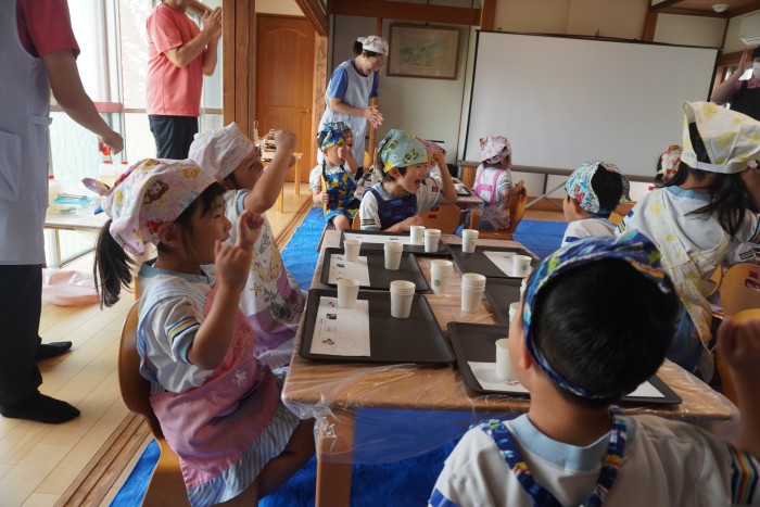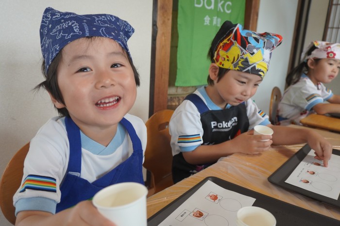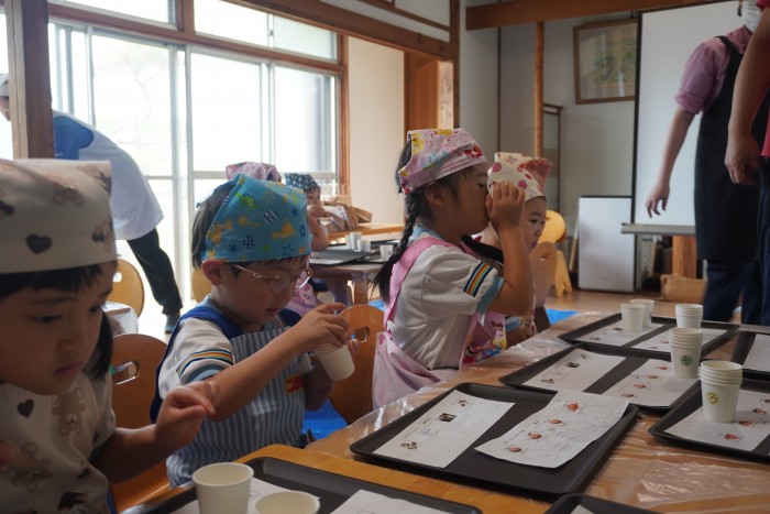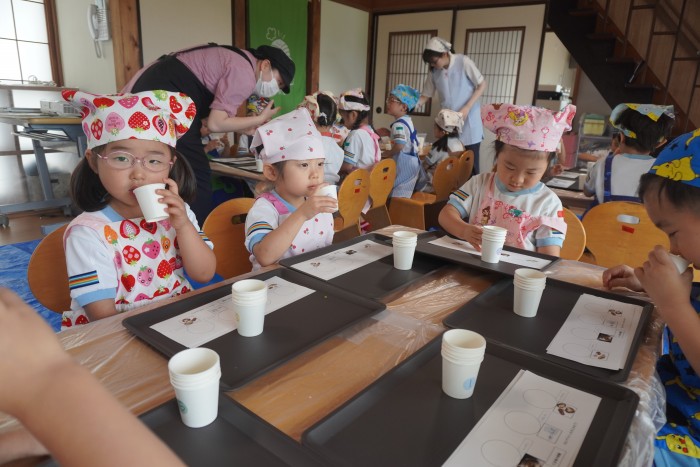 においも嗅いでみて、「これ鰹節のにおいがする!」「しいたけのにおいかな~?」とにおいだけでも当てている子がいました!実際に飲んでみて「美味しい!」「いつもの出汁の味がする!」とみんな楽しそうにクイズをしていました!