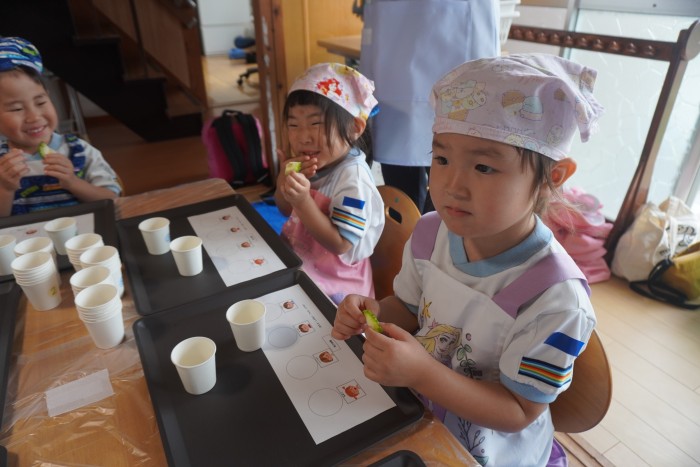 どんな味がするか、シートを使ってクイズもしました!食べてみて感じた味のところに紙コップを置き、正解発表をしました!「当たった!」「ちょっと違った~」とみんな楽しんでいました!苦味のクイズで出たゴーヤはみんな苦かったようで、顔をしかめている子がたくさんいました!
