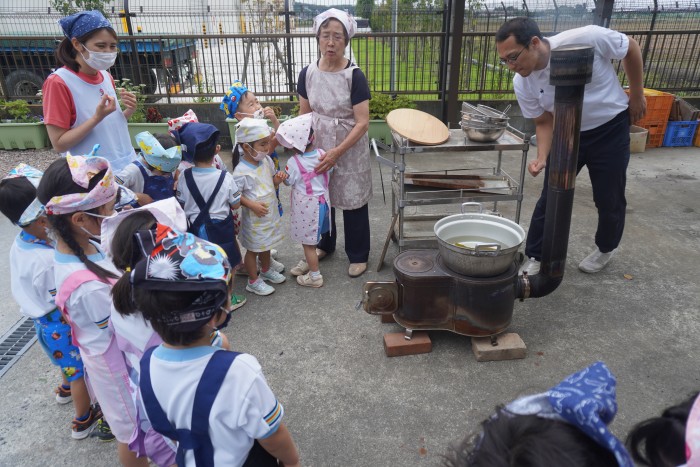 かまどで出汁が出ている様子を見てから、お味噌汁作りをしました。