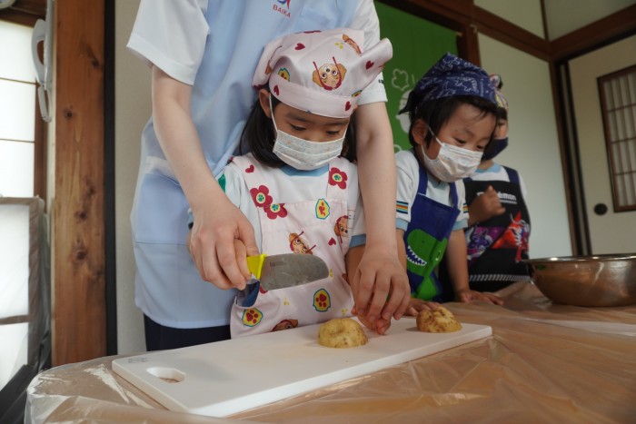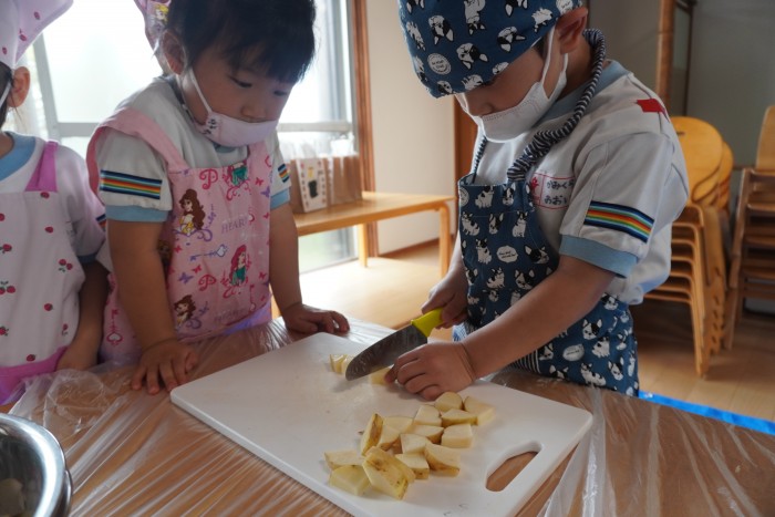 玉ねぎ、人参、じゃがいもをみんなで切りました!「左手は猫の手だよね!」「お家でもやってるから一人でもできるよ!」とみんな包丁で切ることがだんだん上手になってきていました!