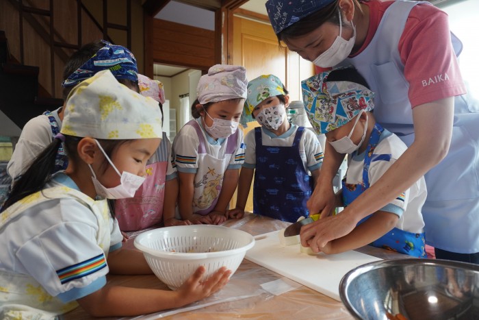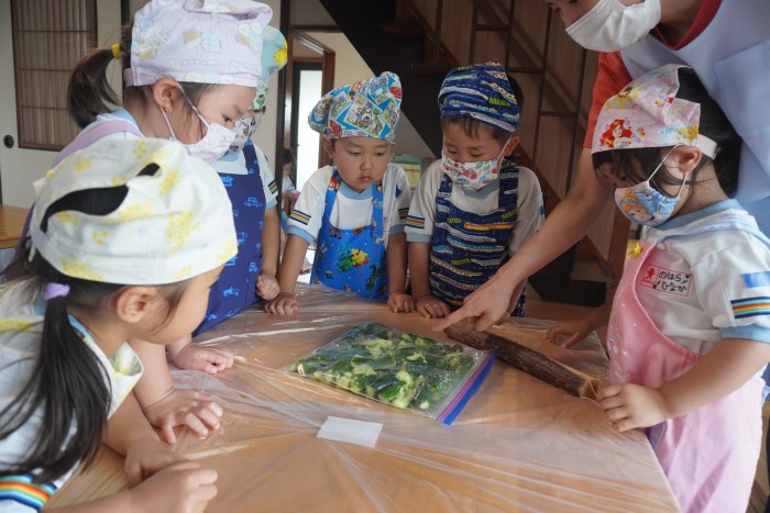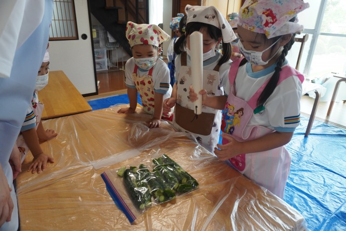 きゅうりも叩いてきゅうり漬けを作りました。力を入れて叩き、小さくなるまでみんなで交代しながら叩くことができました!