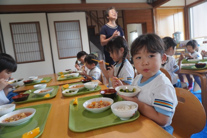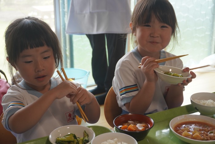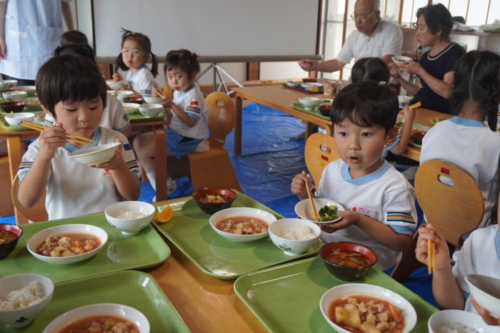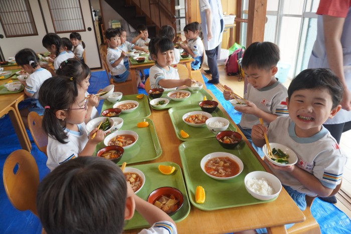 出来上がった給食をみんなで食べました!「頑張って作ったからお腹すいた~」「みんなで作ったからいつもより美味しい!」「いっぱいおかわりする!」とみんな夢中になっていつもよりたくさん食べていました!