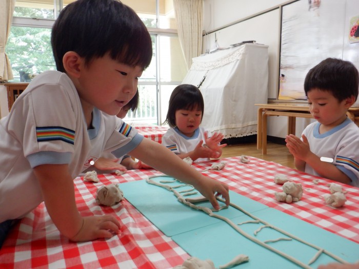 新幹線を走らせるためにみんなで線路を作りました。「蛇さんにゅろにゅろで長くしてみようね!」と言うと、「分かった!!」とたくさん蛇さんを作っていました。「ここにもつなげちゃおう!」と長い線路が完成しました!
