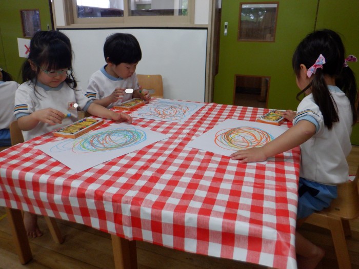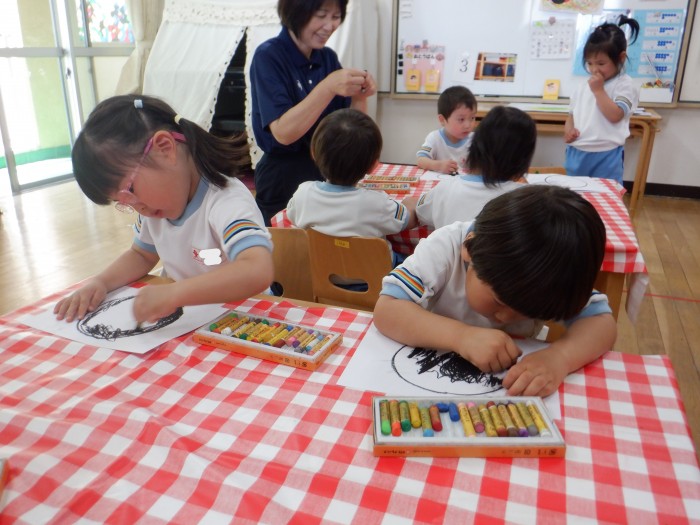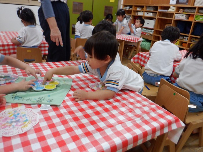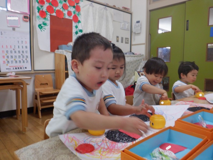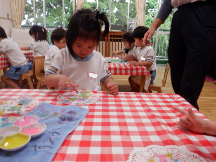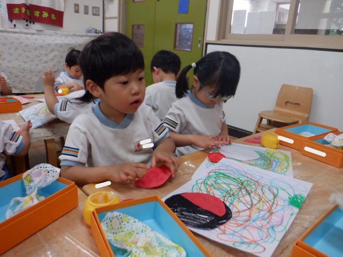 丸の中を上手に塗っていたすみれ組さんのお友達です。羽鋏を使って線を切りました。線の上を上手に切っていました。黒の絵の具で指スタンプをしました。「優しく押すんだよね!」とお友達で話していました。
