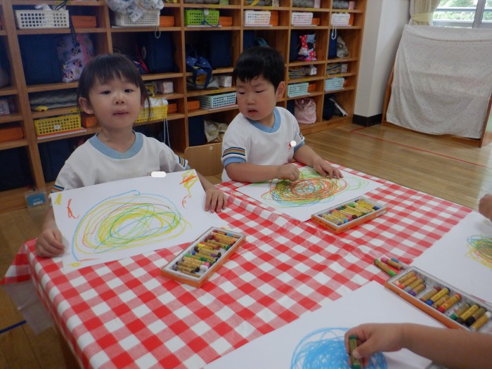 画用紙になぐり描きをしました。ちょうちょさんやてんとう虫さんが飛んでいるところを想像しながら、明るい色でたくさん描いていました🖍️