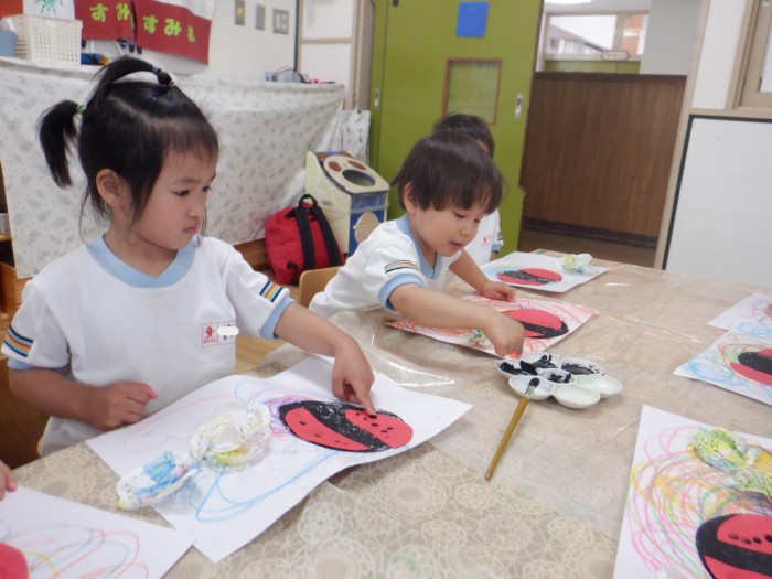 てんとう虫さんの身体は黒のクレヨンで塗りつぶしをしました🐞