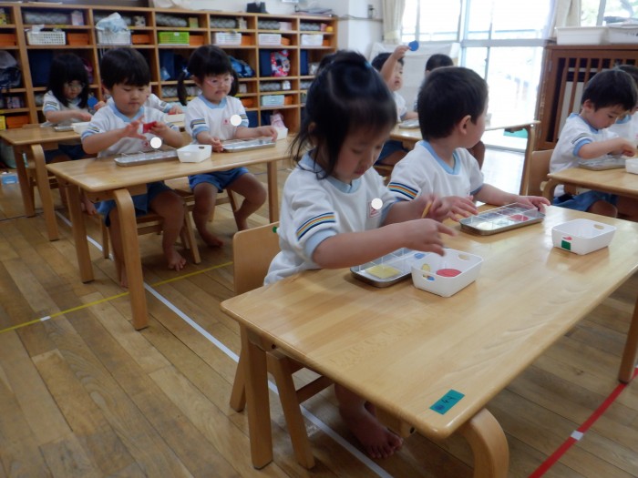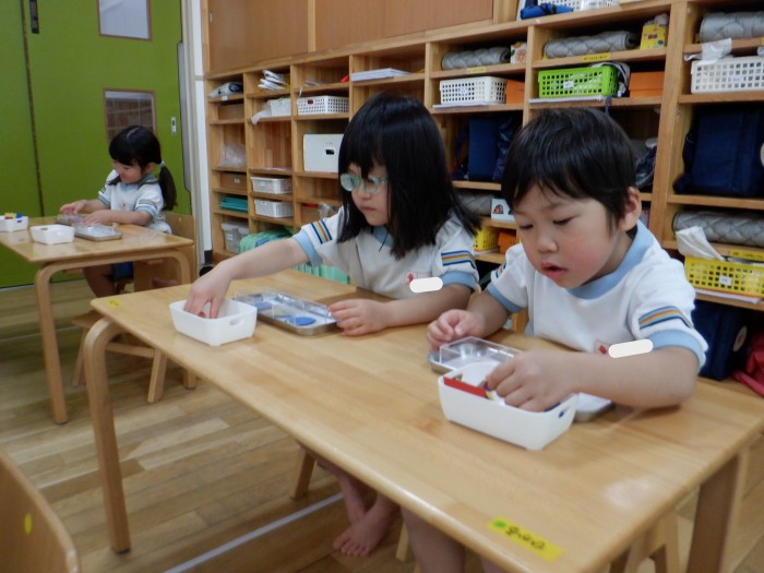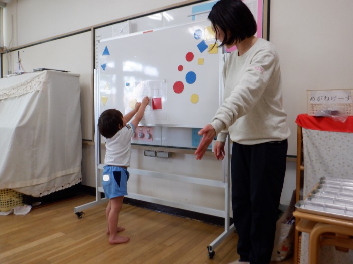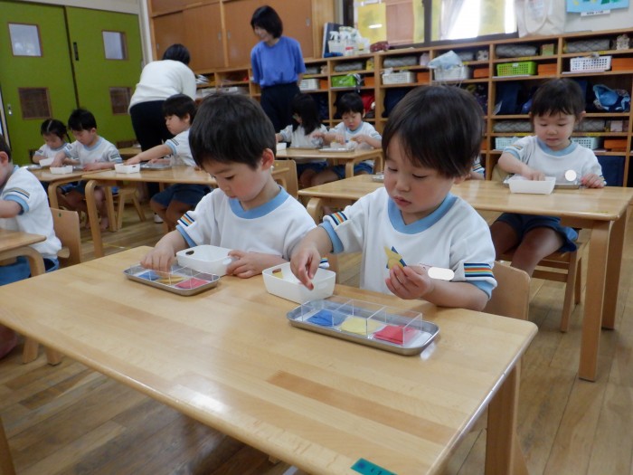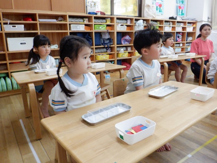 初めに〇、△、▢を分ける練習をしました。先生がお手本をするとすぐに分かり、自分の容器に置いていました。