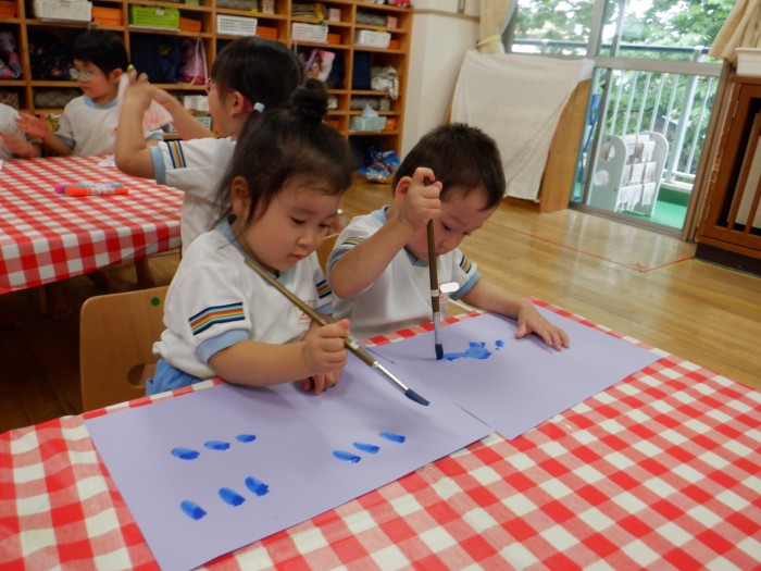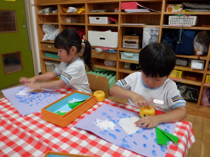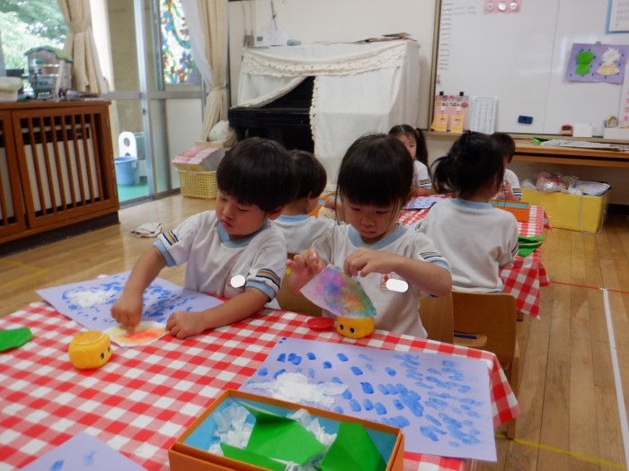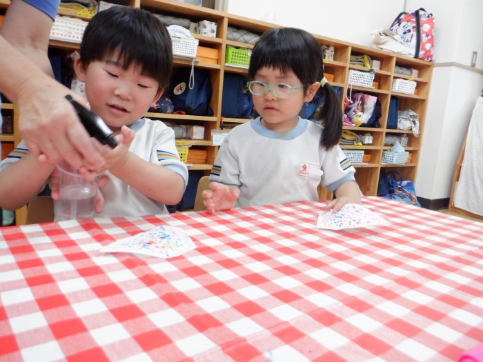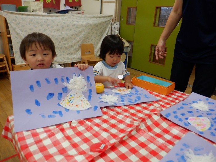てるてる坊主は、顔をティッシュでビリビリ破いたり、身体の部分は、マッキーペンでなぐり描きをし、水を加えると色が広がるのを楽しんでいました!
