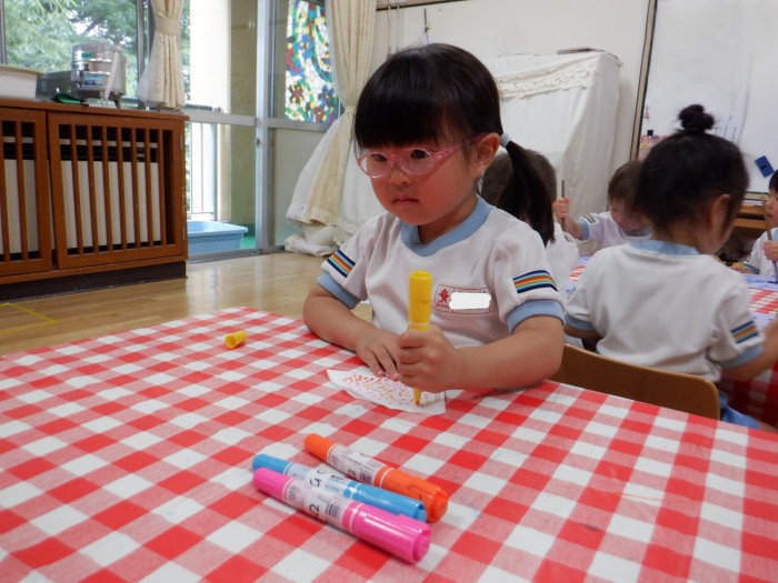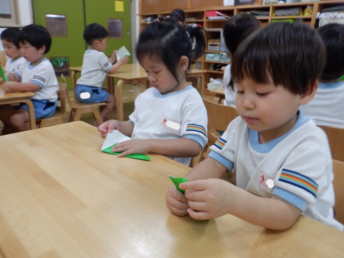 カエルは、折り紙をしました。先生が作るのをよく見て一つ一つ丁寧にやっていました🐸