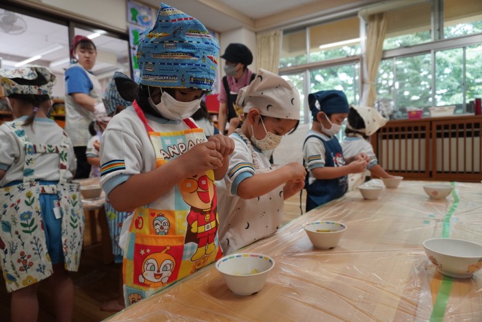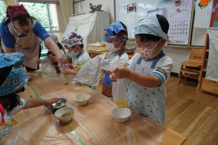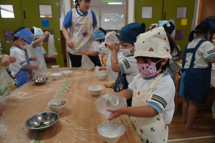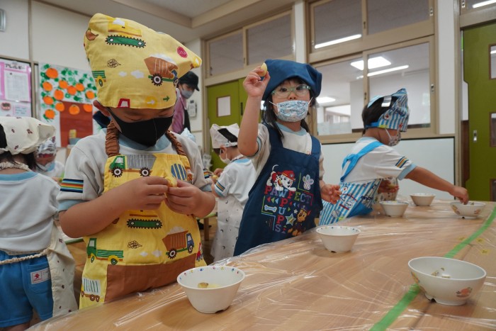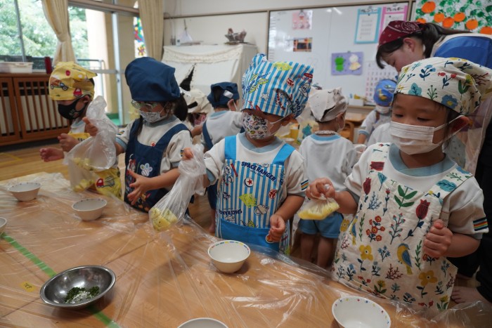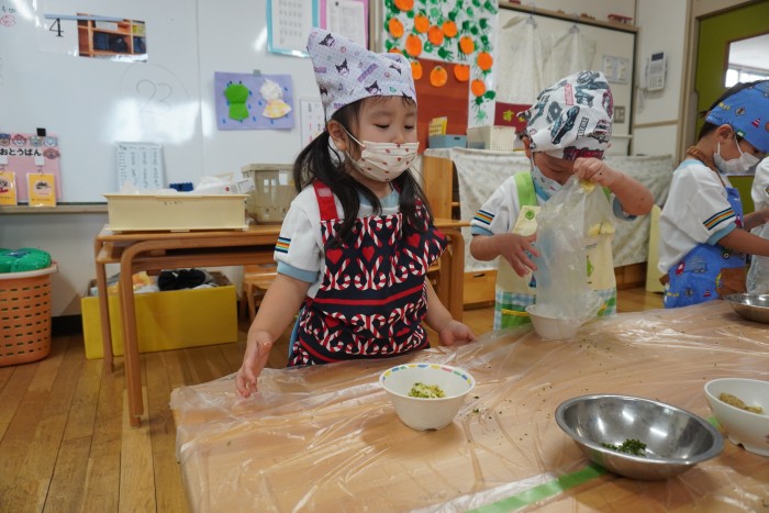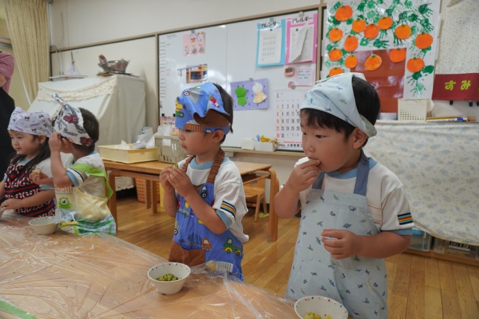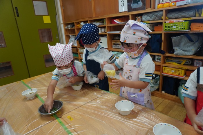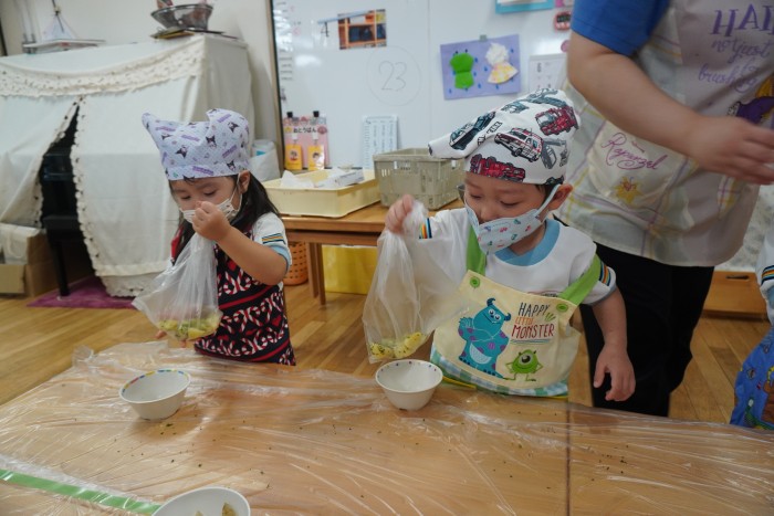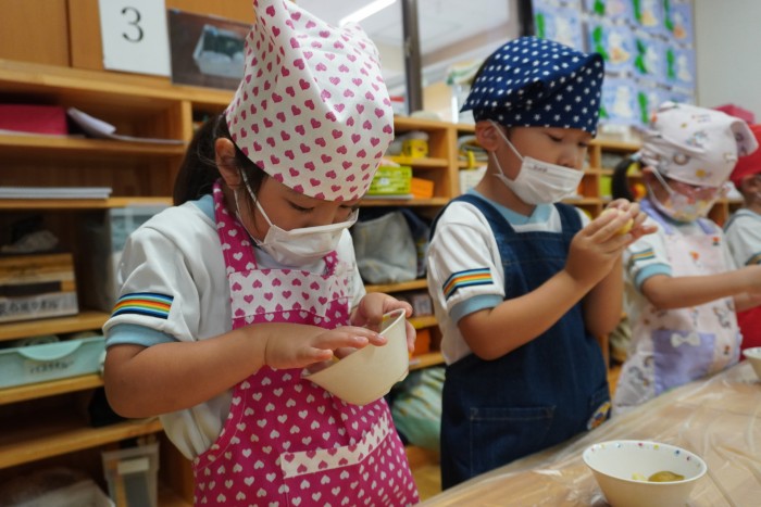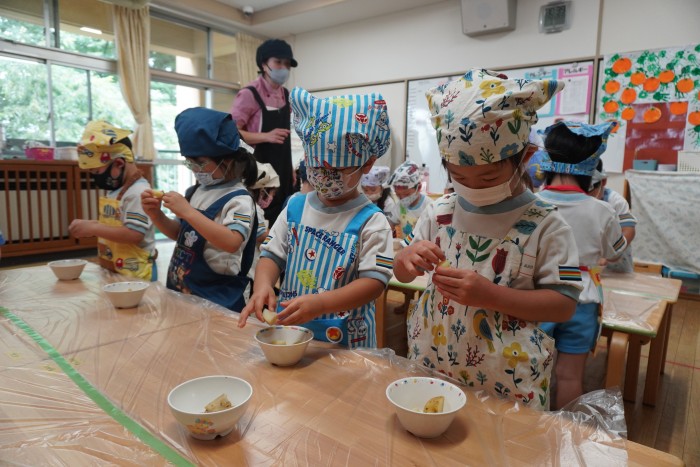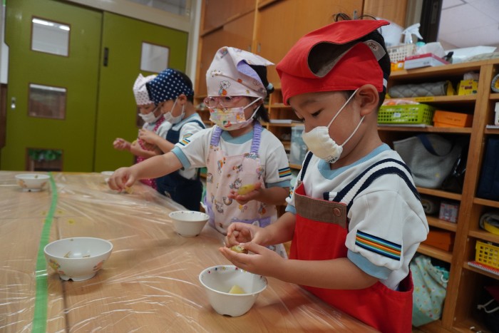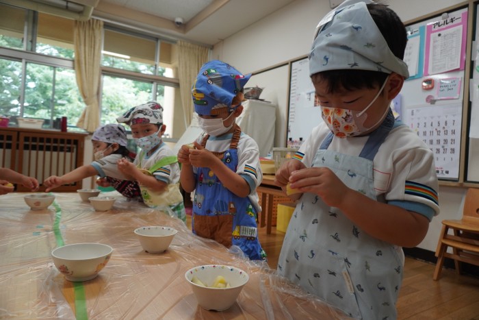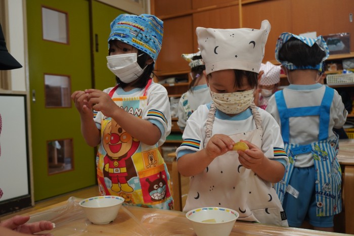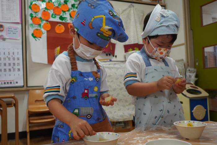 指先を上手に使って皮をむき、薄い皮を上手にむくすみれ組のお友だち☺️
