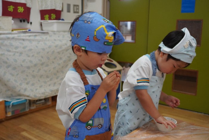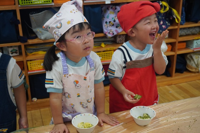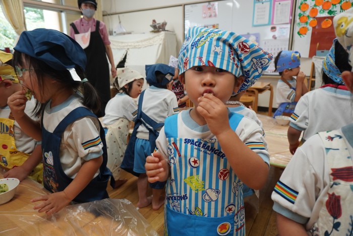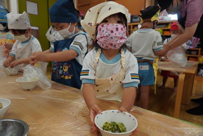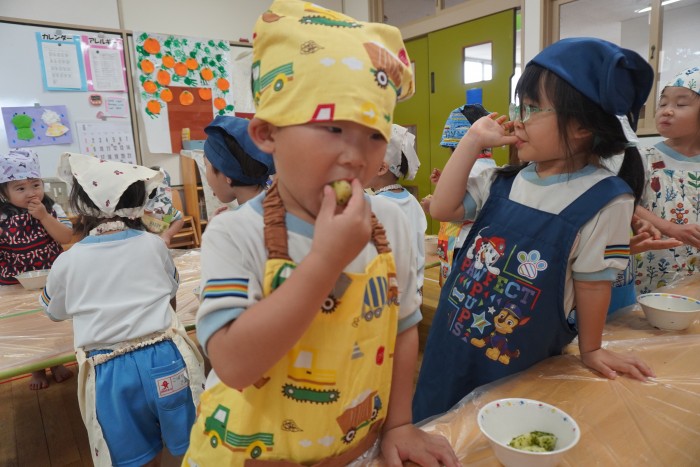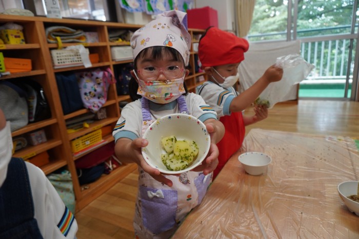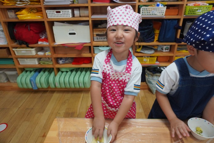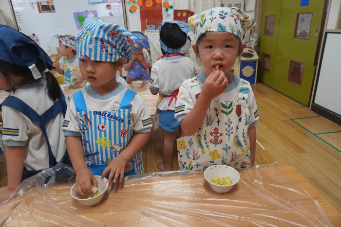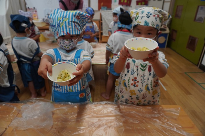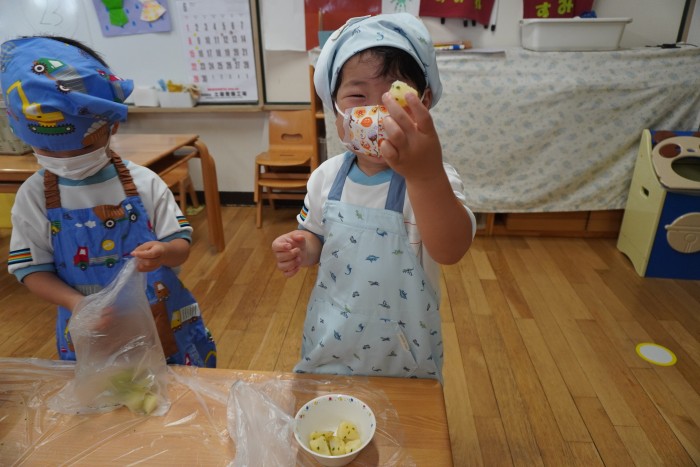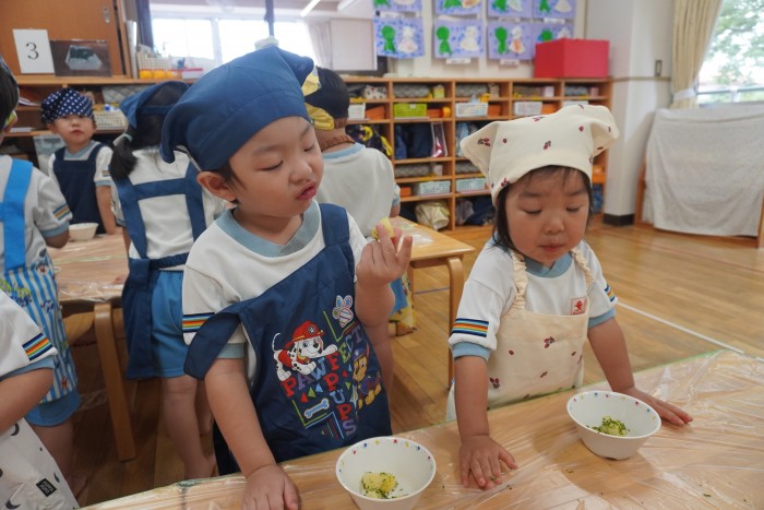 自分で作ったじゃがいもを食べてニコニコ笑顔のすみれ組さんでした☺️