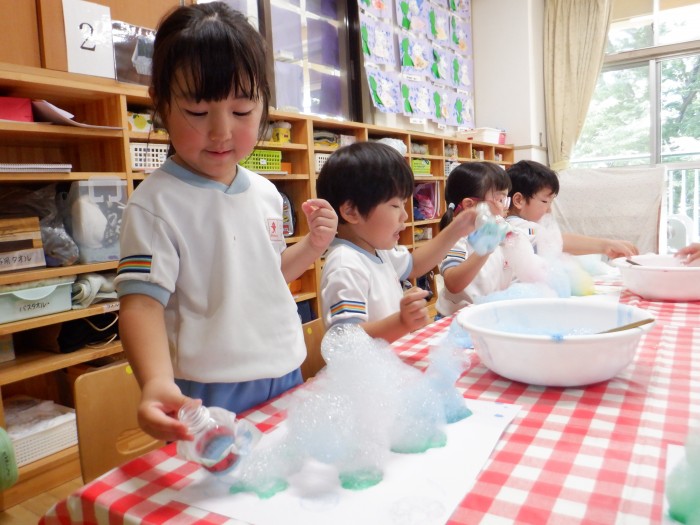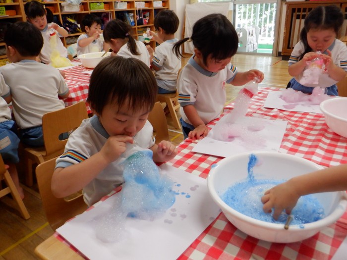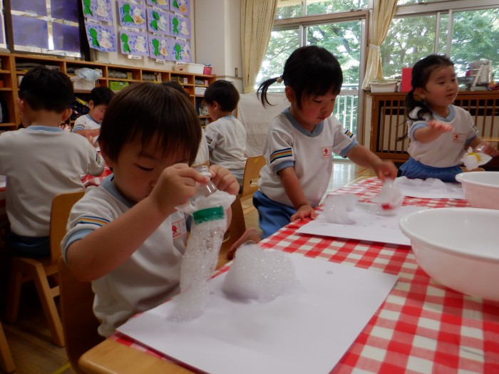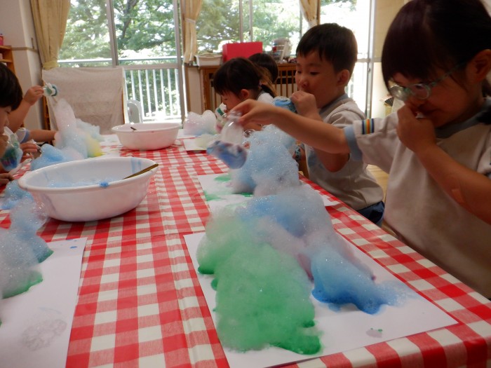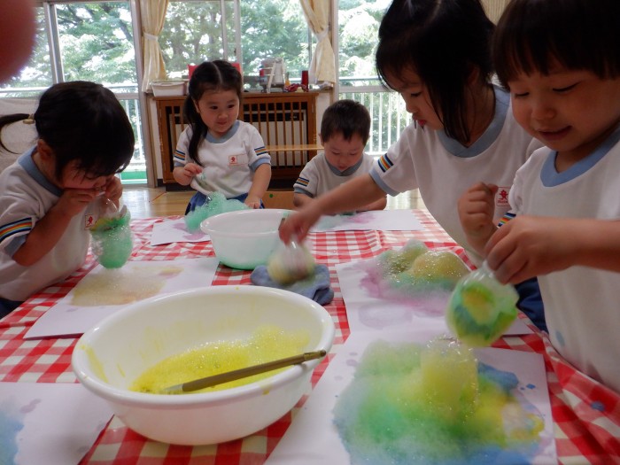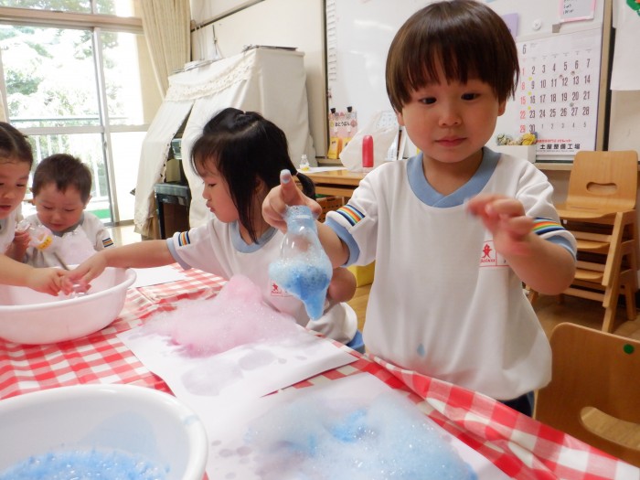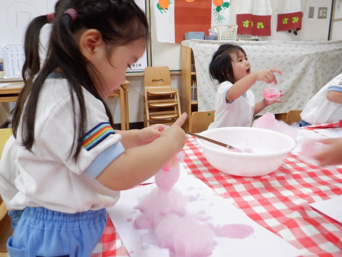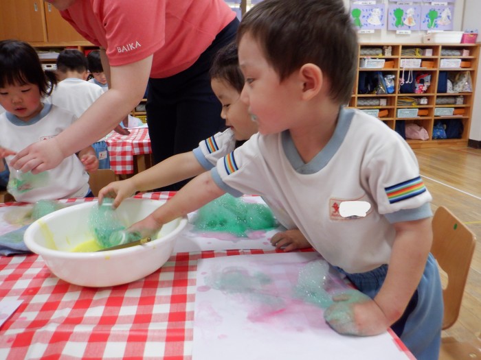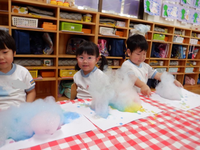 「色のついた雲みたい~」「綿あめみたいでおいしそう~」「お山みたいに大きくなってきたよ!」と楽しそうに泡を触る様子が見られました。