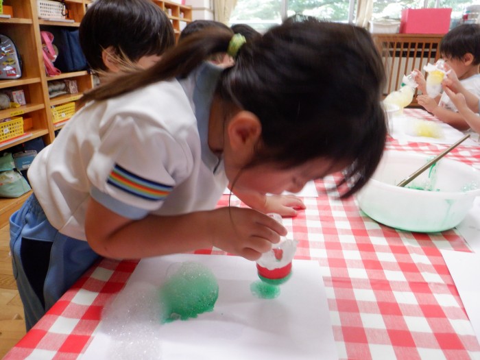 泡に好きな色をつけてフーっと吹いたら、色のついた泡がたくさん♪