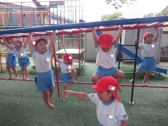 ぶら下がってゆらゆら揺れて楽しみ、「一緒にやろう!」とお友達と遊んでいます!
