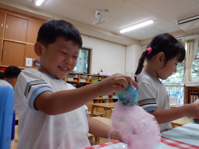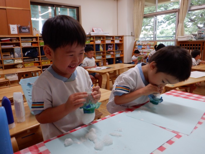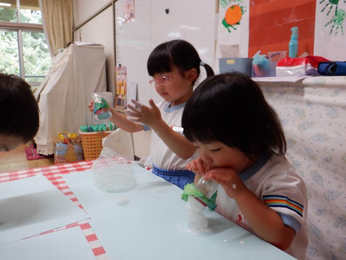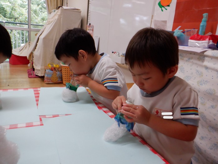 泡遊びでかき氷の背景を作りました。泡が出てくるのを楽しんで沢山息を吹いていました。