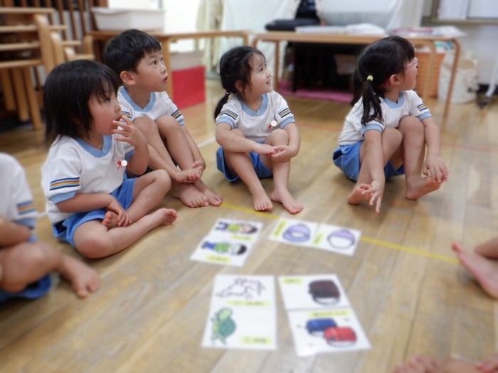 「あかるい」の反対は「くらい」など様々な反対言葉について学んでいるすみれ組のお友達。