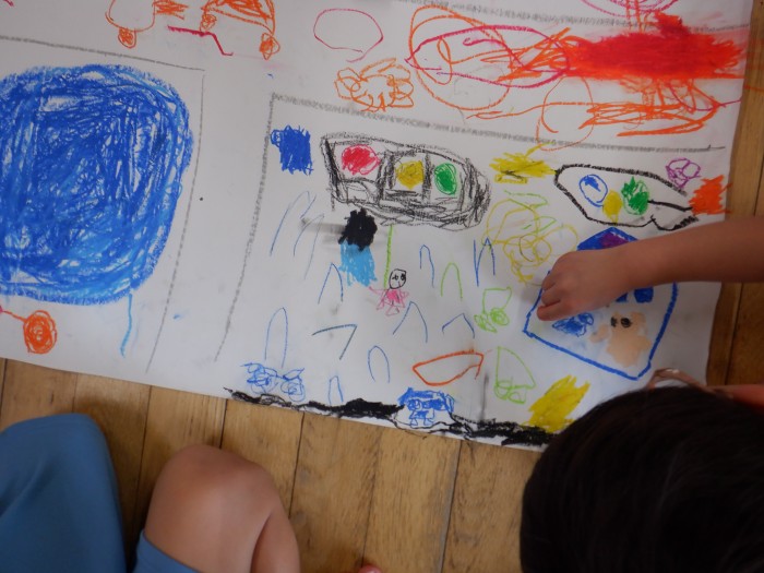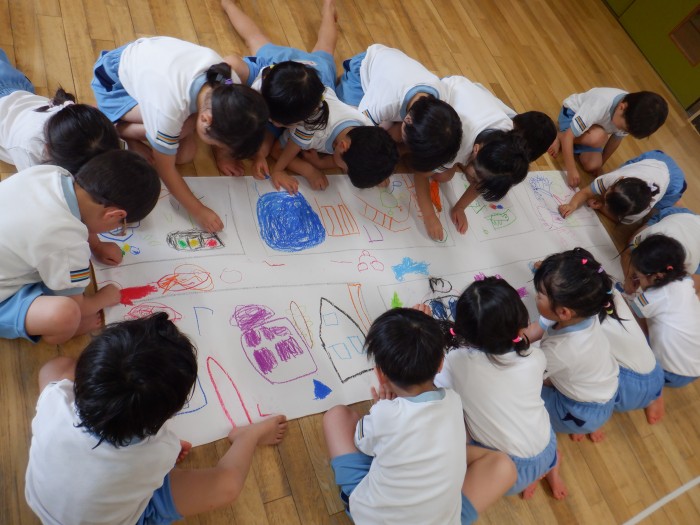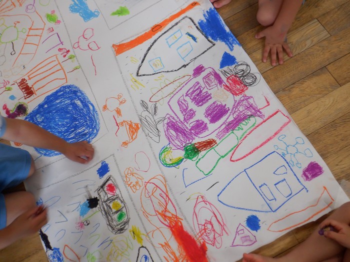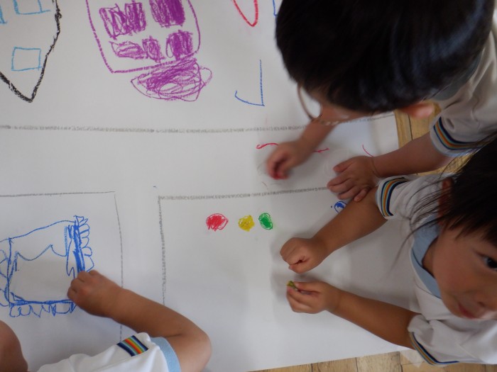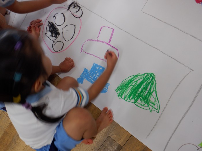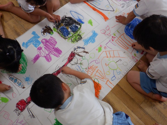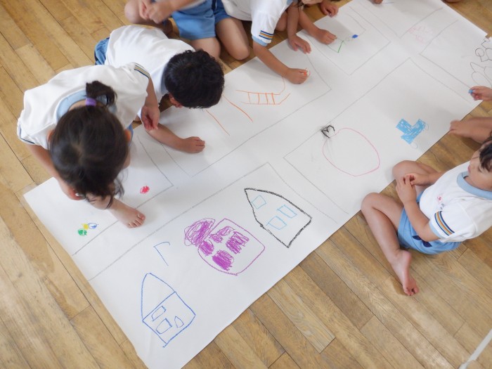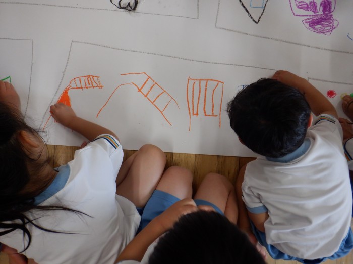 「私はここを描くから、こっちを描いてくれる?」と協力して街を完成させようとしている子もいました。