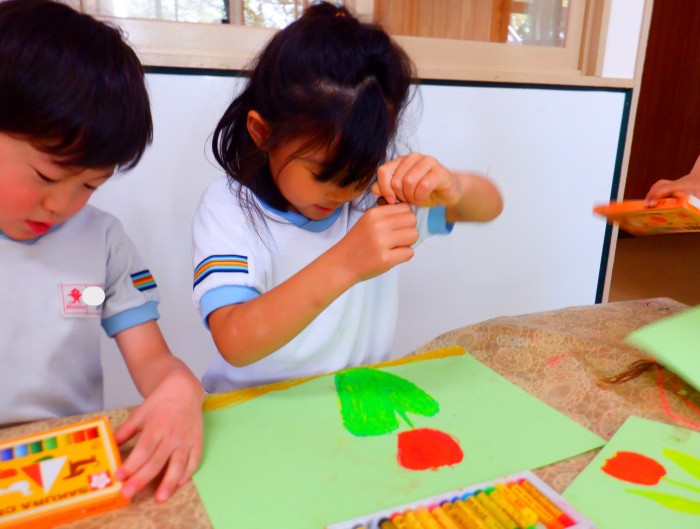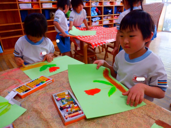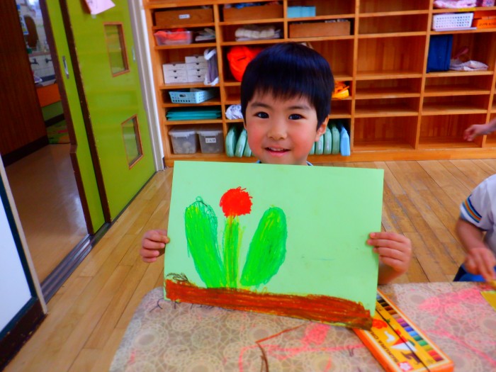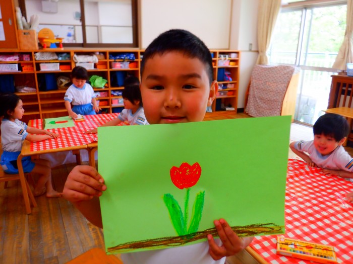 「黄色に赤を重ねてる!」「良い匂いがしてくるかな?」「チューリップの葉っぱって大きいんだね!」と、細かいところまでお手本をよく見て描くことができました!