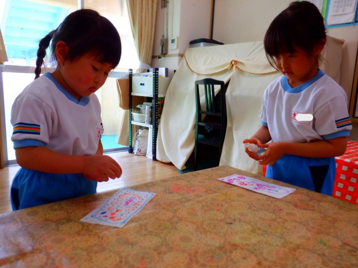 キッチンペーパーにペンで線を描いて水を吹きかけ、色がだんだんと滲んでいく様子に「きれい!」と、感動していたとんぼ組さんです!🎨