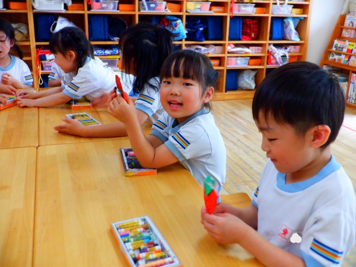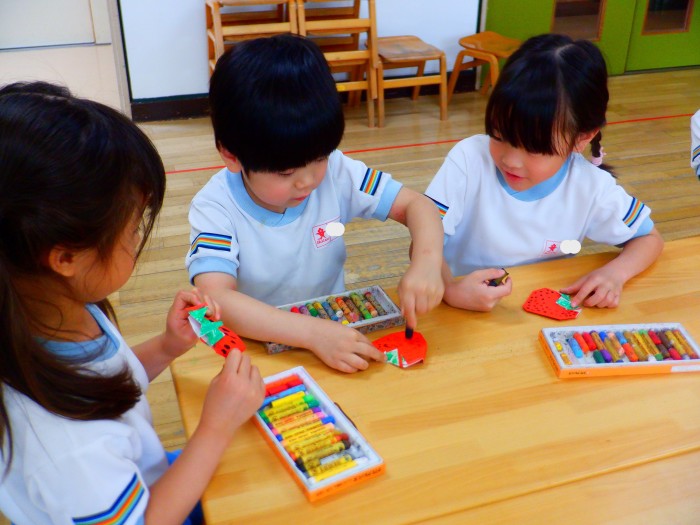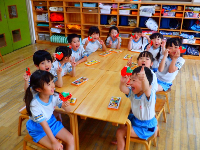 角をピッタリ合わせることが上手になったとんぼ組さん。折り進めていくと、段々といちごの形に近づいていくのが分かって、「次はこうかな?」「ここ三角だと思う!」と次の折り方を予想しながら作っていました。