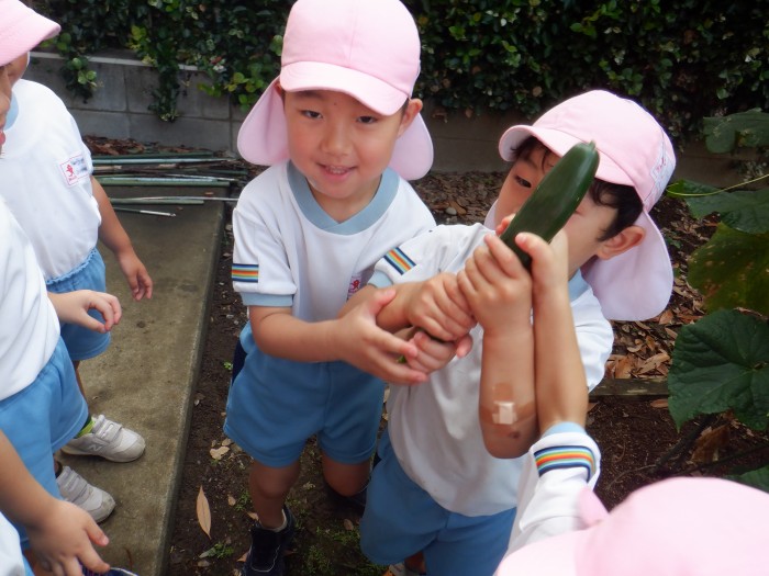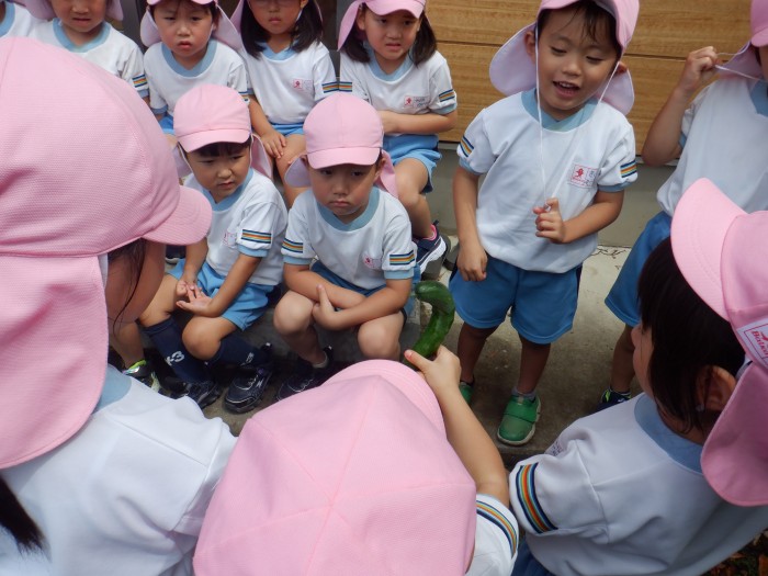 「きゅうりはなんだかチクチクして痛いね」「ナス大きくて重たい!」と収穫した野菜を触って感触を楽しんでいました!