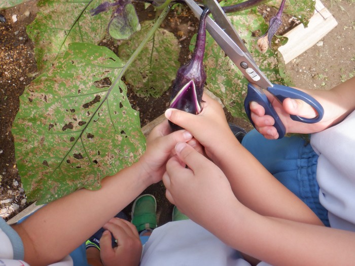 園の畑できゅうりとナスの収穫をしました。