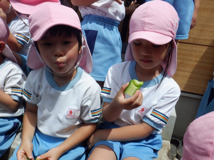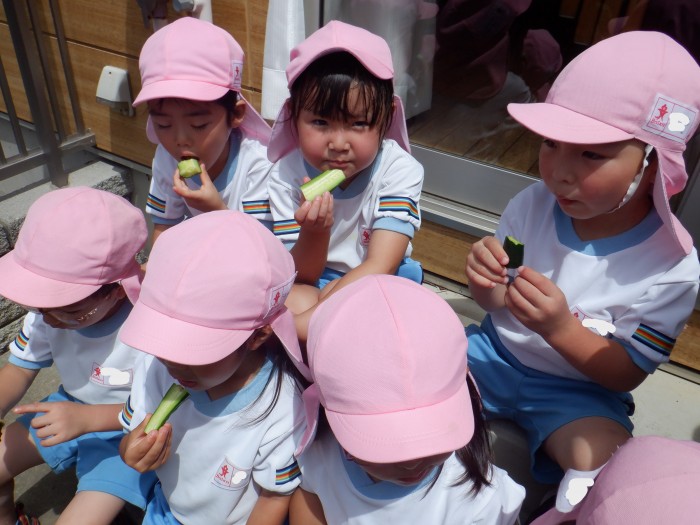 収穫したきゅうりをみんなで食べました。「採りたてだから美味しい!」「みんなで食べると楽しいね~」「これ誰がとったきゅうりかな?」などお友達とお話しをしながら夢中になって食べていました!