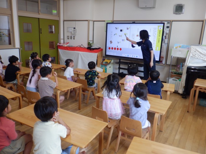 「暑いの反対は?」「高いの反対は?」と聞くとみんな大きな声で「寒い!」「低い!」と応えていました(^^)