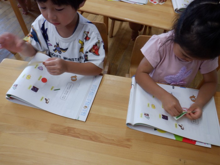 反対言葉のところにシールを貼ってみました。「長いの反対はこれかな?」「もう全部わかっちゃうよ!」とすぐにシールを貼ることができました!