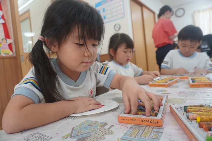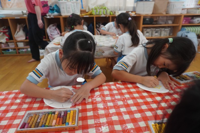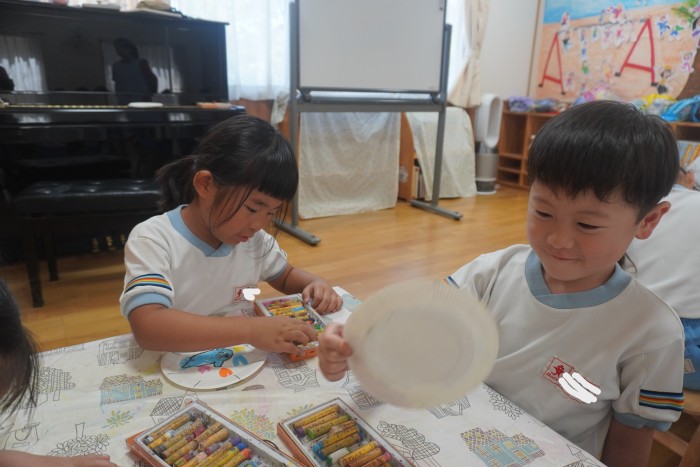 次は紙皿に好きな絵を描いて、線に合わせて切り込みを入れてフリスビーの完成♪