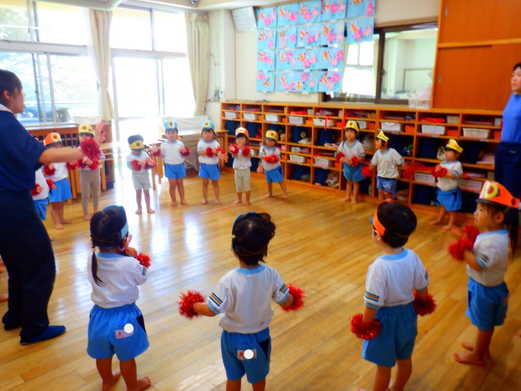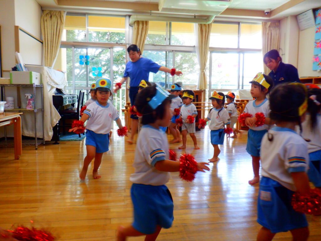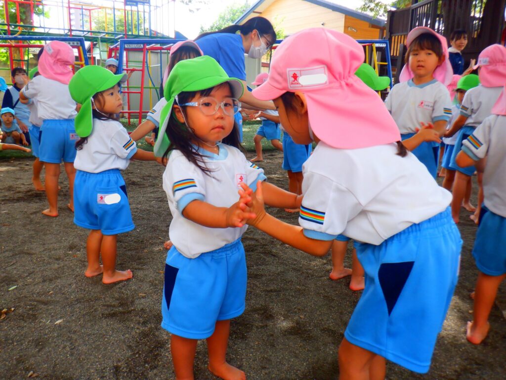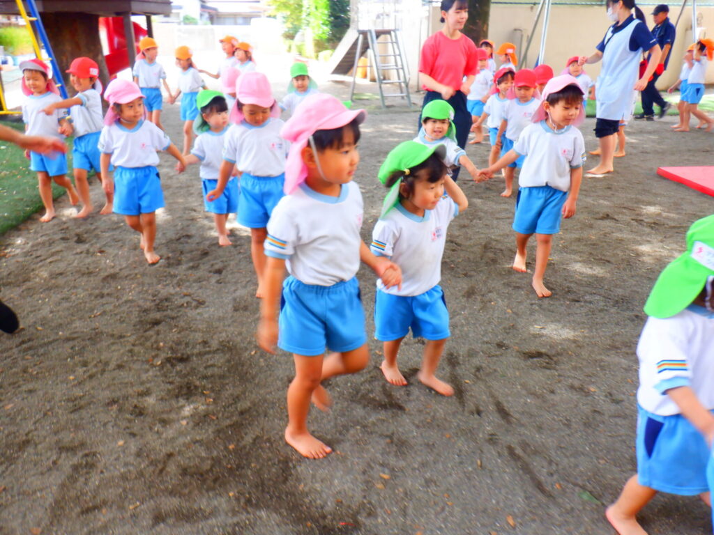 お遊戯ではわたあめジェットの歌に乗せてお部屋でも園庭でもたくさん踊りました。みんなでまーるくなーれと大きな丸を作って手をぐるぐると回して楽しく踊りました🎵