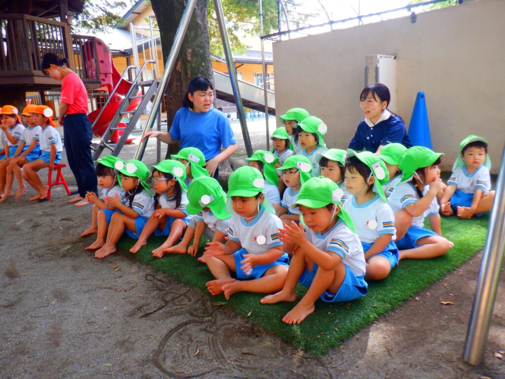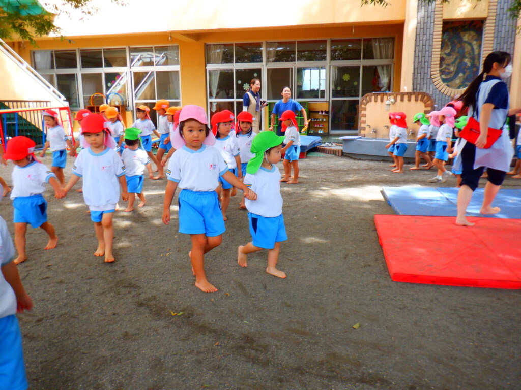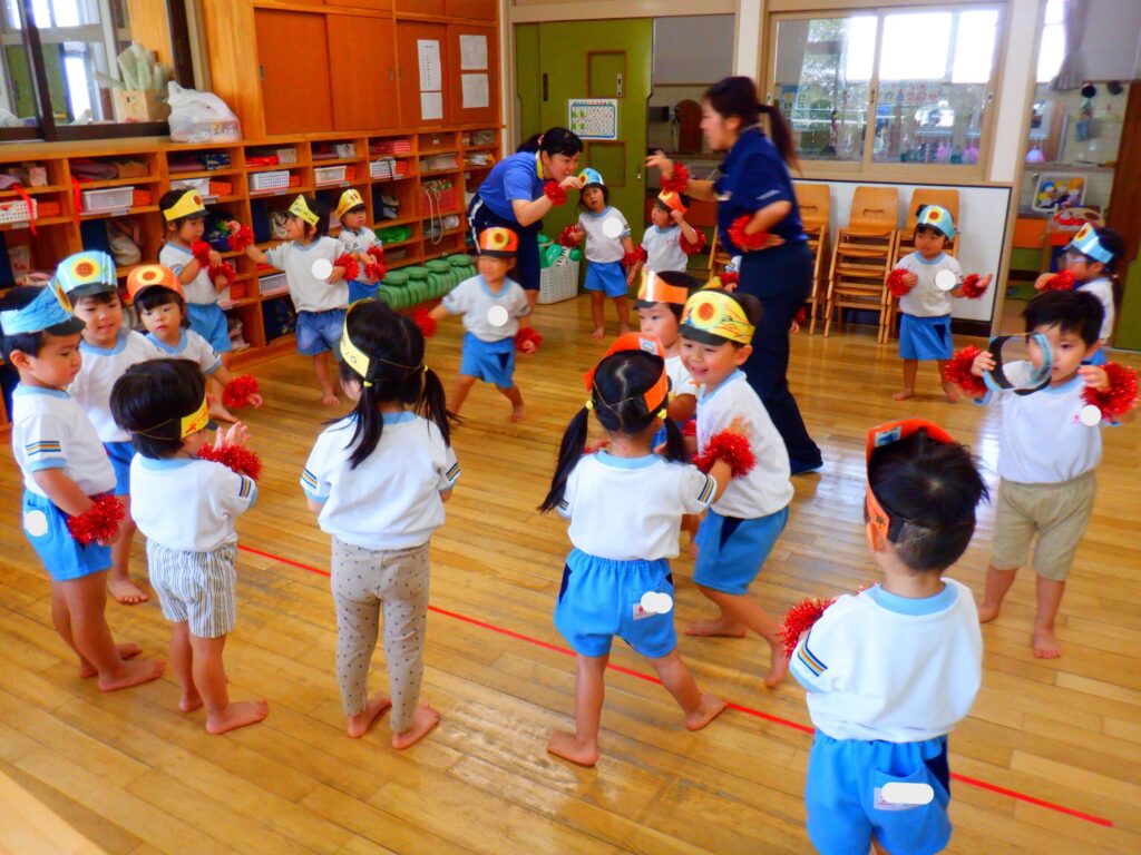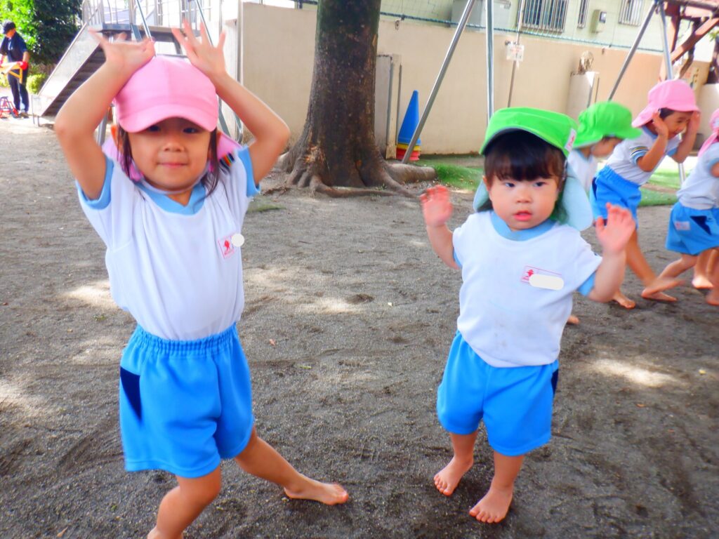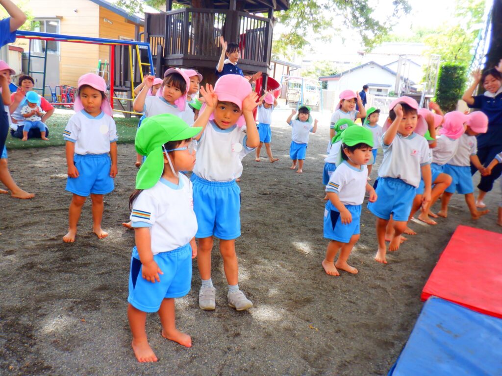 お遊戯ではわたあめジェットの歌に乗せてお部屋でも園庭でもたくさん踊りました。みんなでまーるくなーれと大きな丸を作って手をぐるぐると回して楽しく踊りました🎵