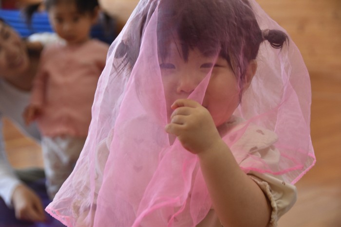 おはながわらったの歌に合わせてスカーフを手の中で丸めて手を開くとスカーフがふわっとお花が咲いたように飛び出てきます❀子どもたちはふわっと出てくる様子を期待して楽しんでいました(^^)