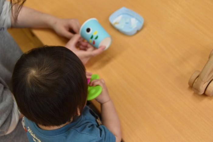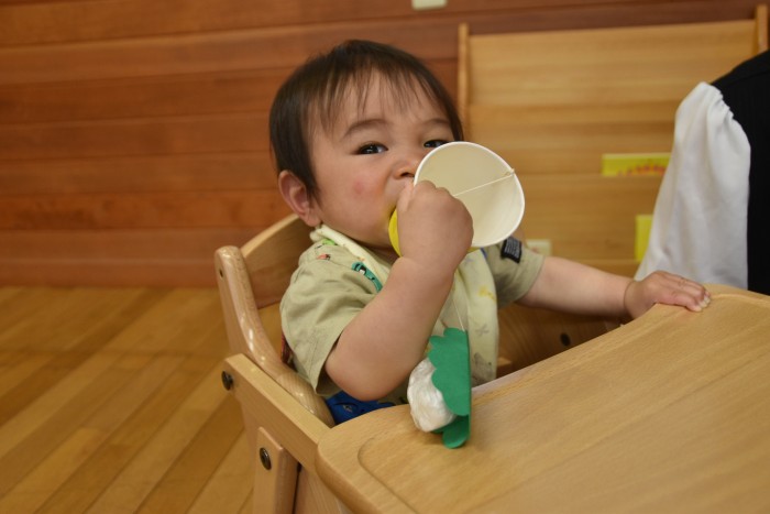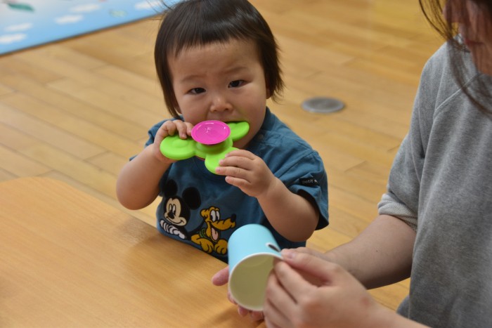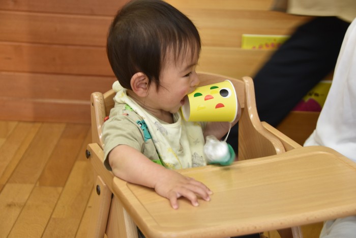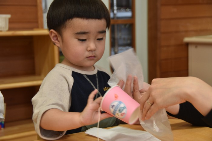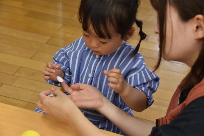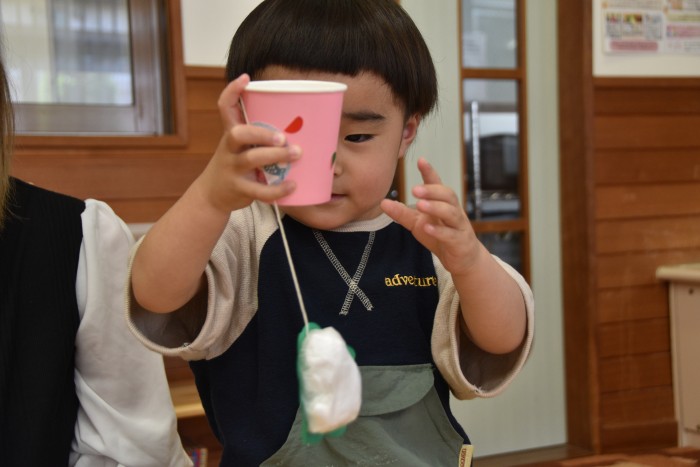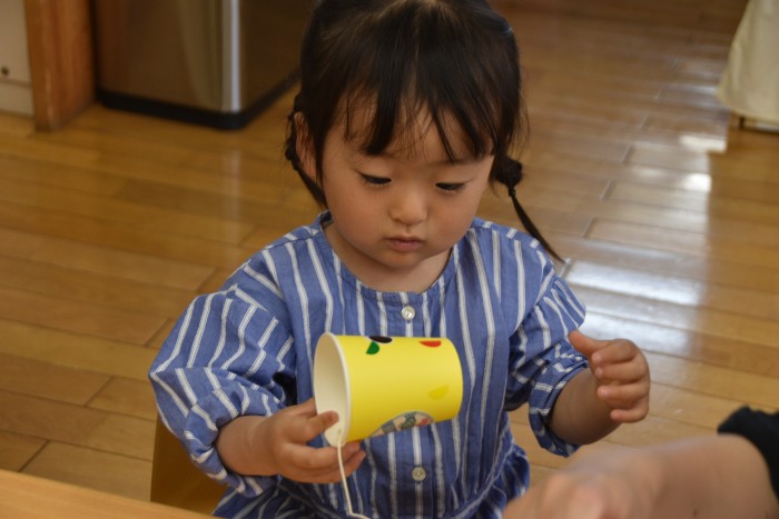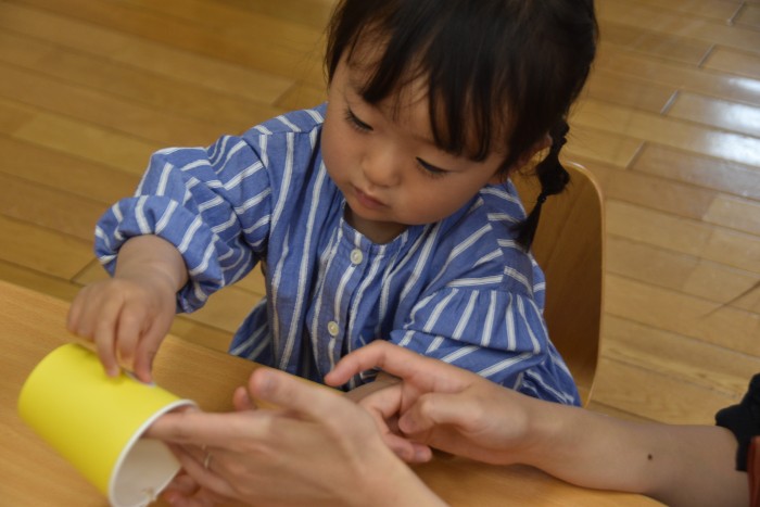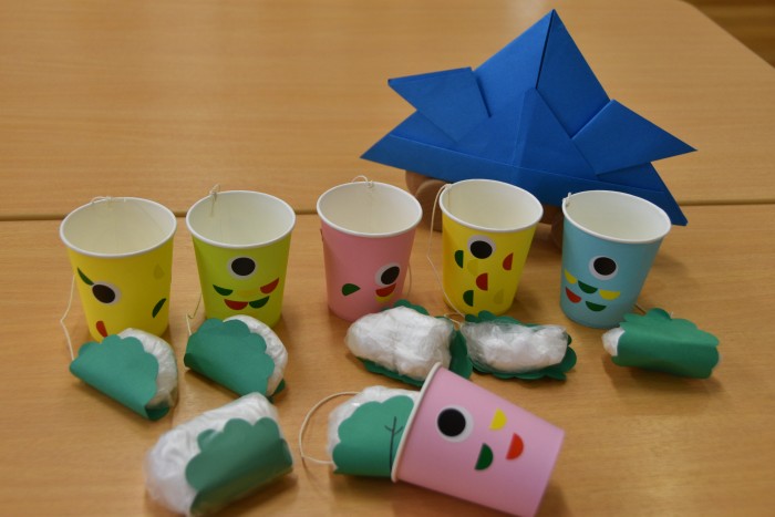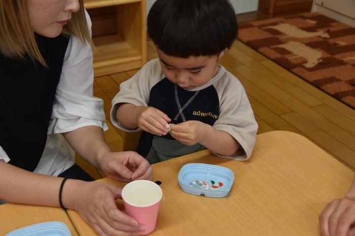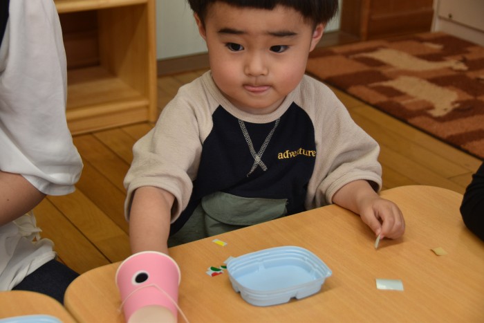 紙コップにシールで模様や目を貼ってこいのぼりを作って