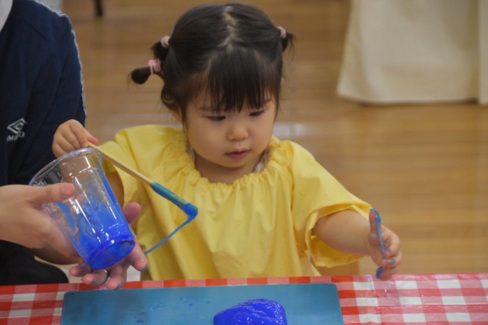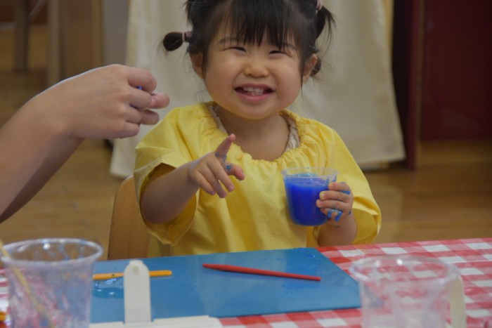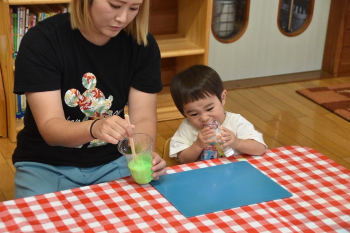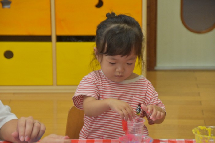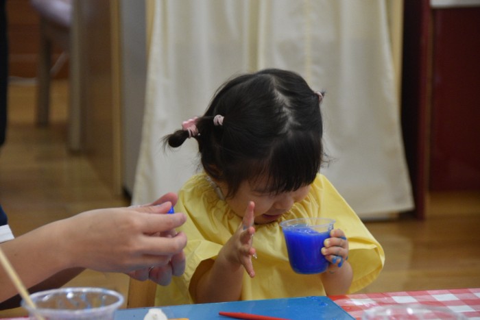 ママと一緒に洗濯のりに水を入れて好きな色の絵の具を混ぜました!