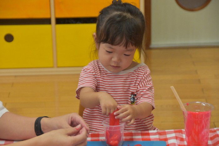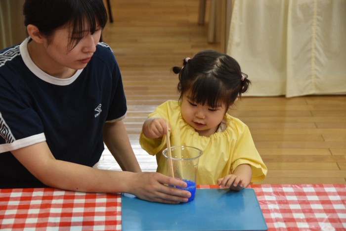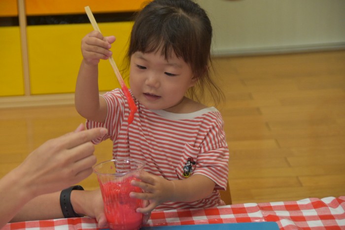 出来上がったスライムを割り箸で混ぜ混ぜしたり手で触った見たりして感触を楽しみましたよ😊