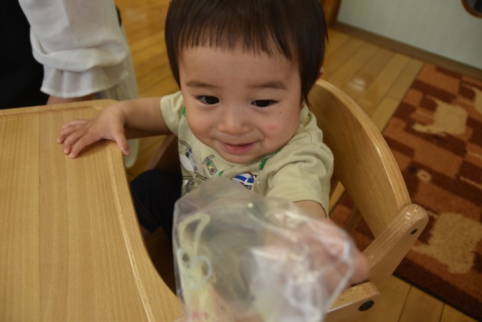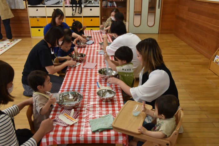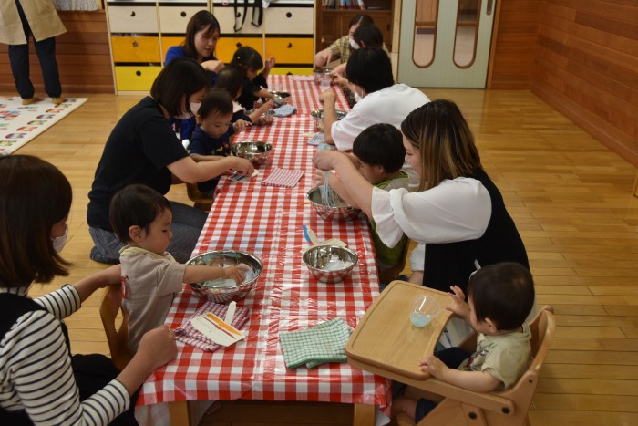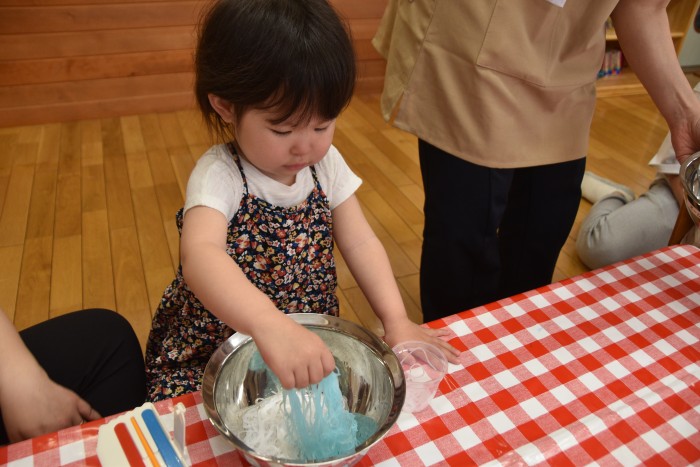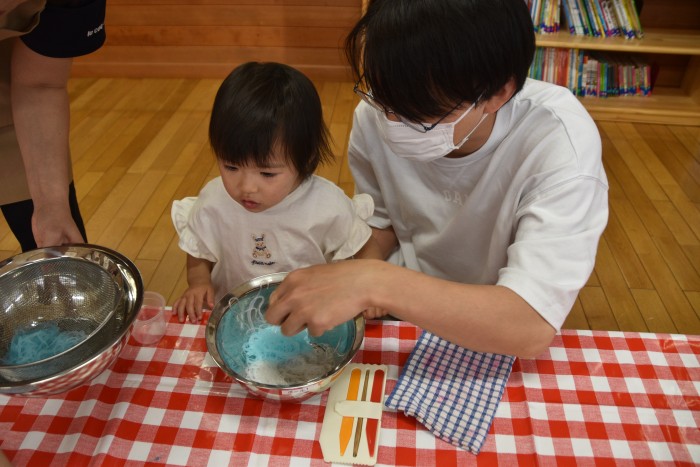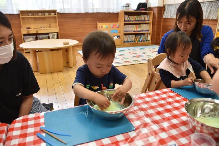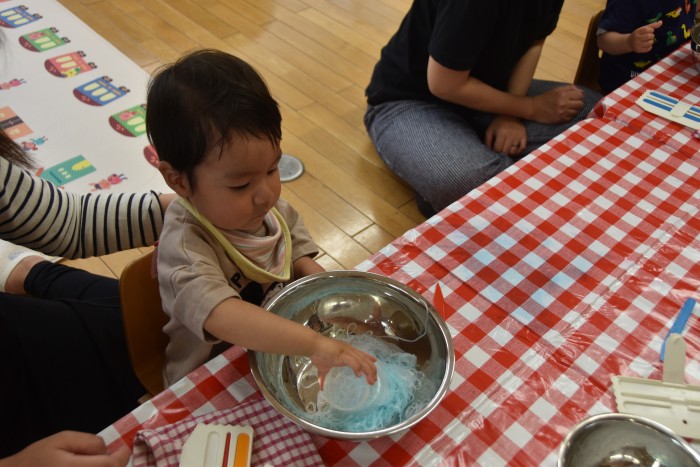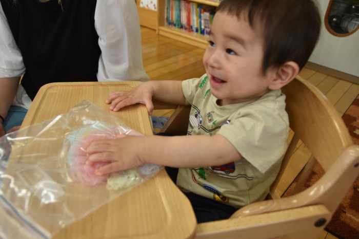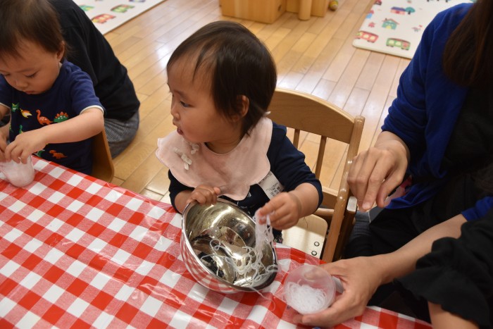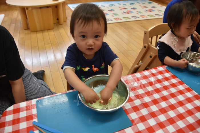 モミモミしたり、移し替えてみたり、ママのまねっこでお料理してみたりと思いおもいに遊んでいましたよ!!