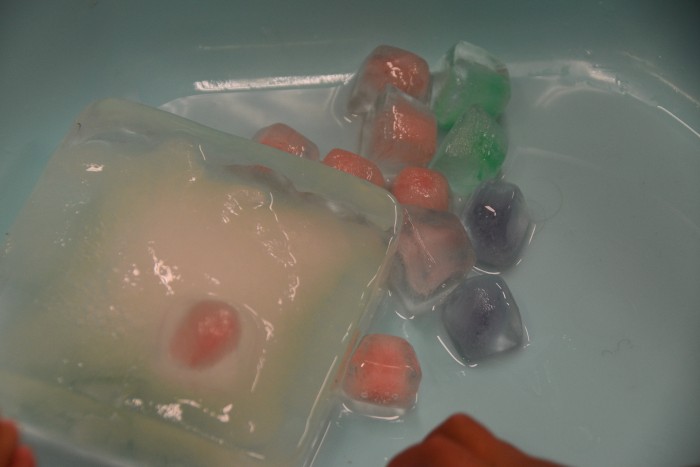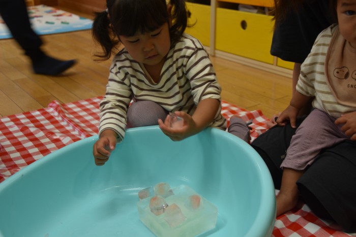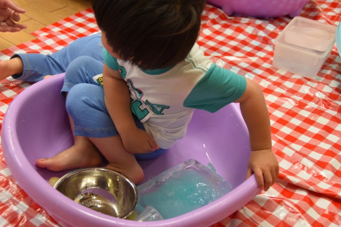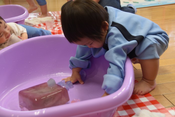 食紅で色を付けた氷をタライに広げ、手や足でピチャピチャ♫