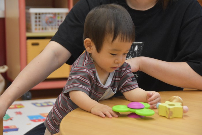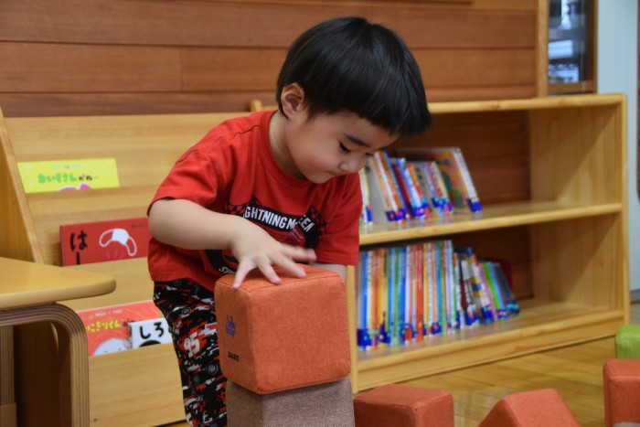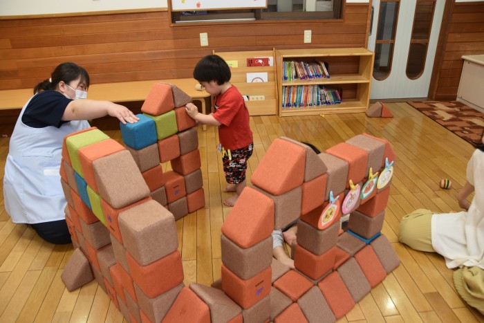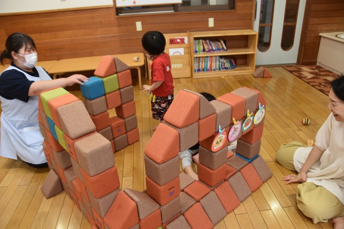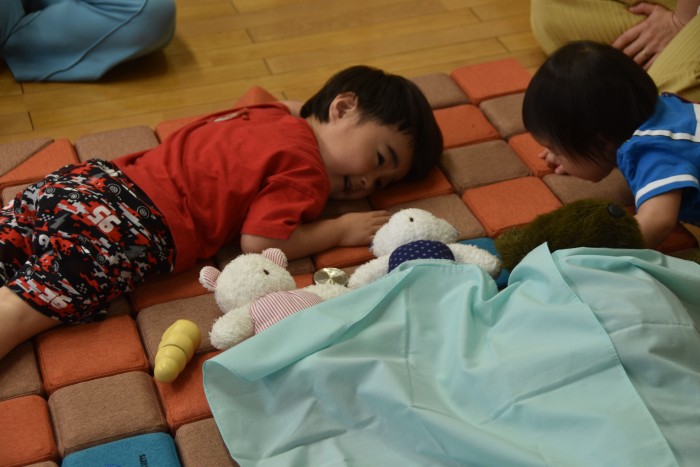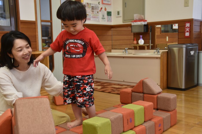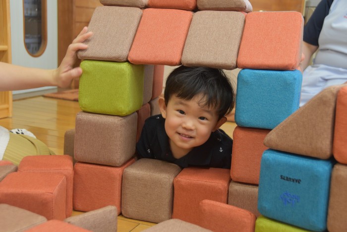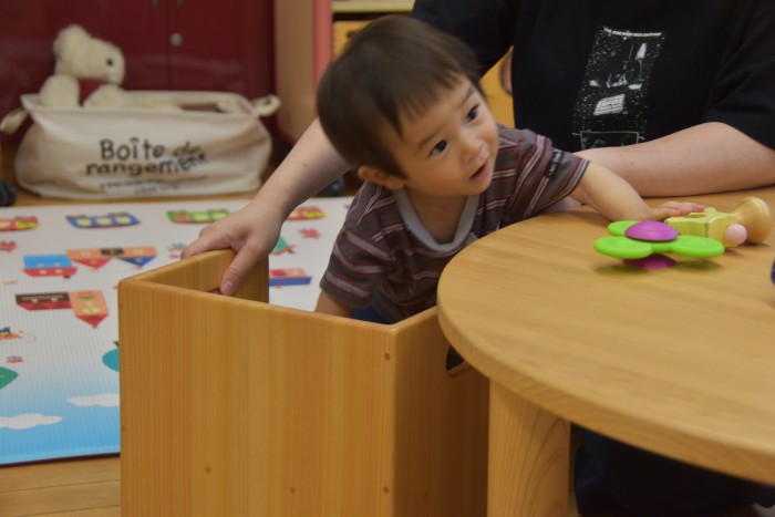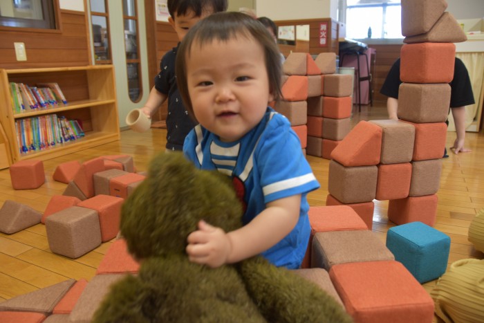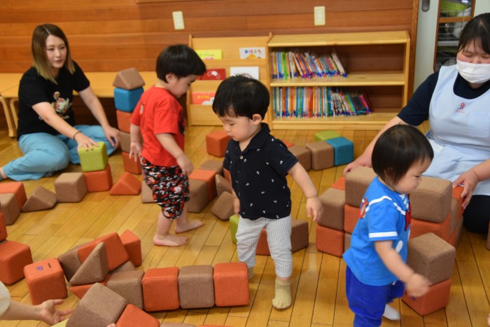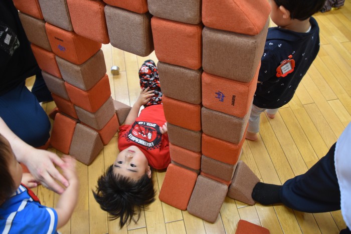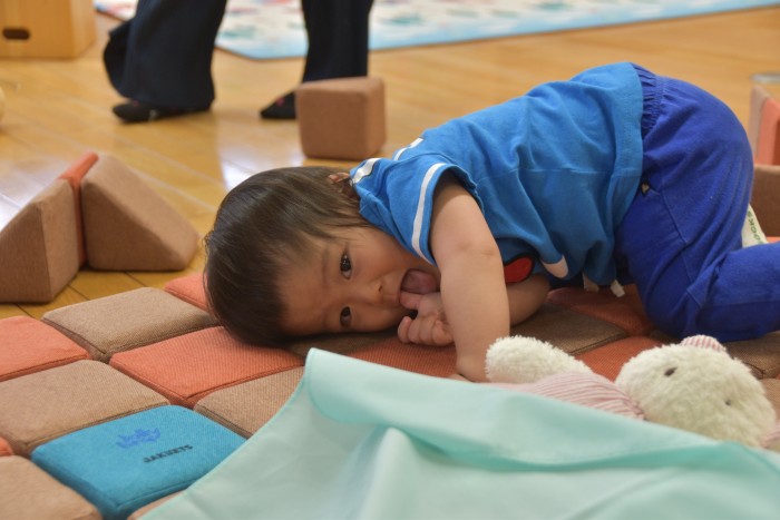 先生やママたちが作ったトンネルをハイハイでくぐってみたり