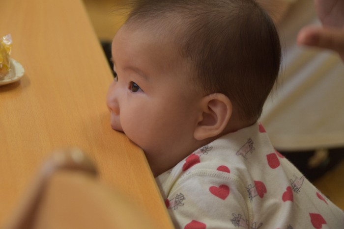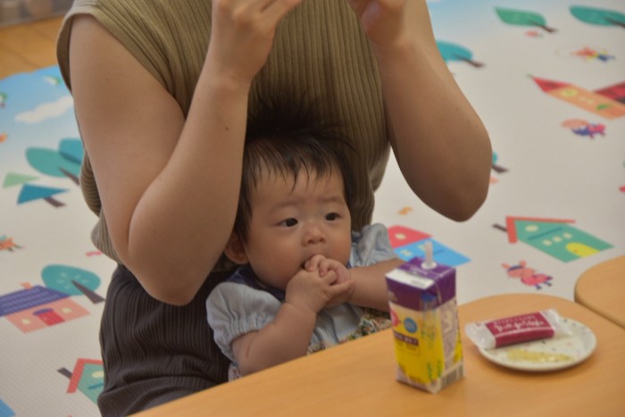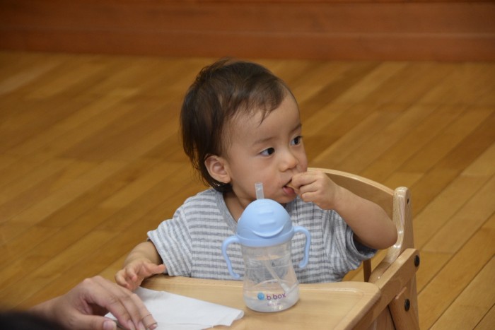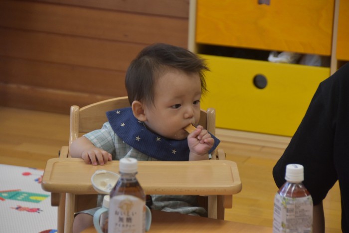 まだ月齢の低いお友達は食べているお友達やママを見てお手々や机をはむはむ🤤❤️