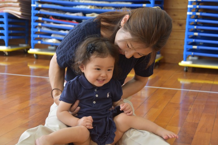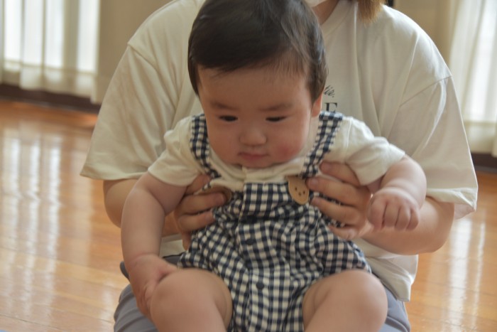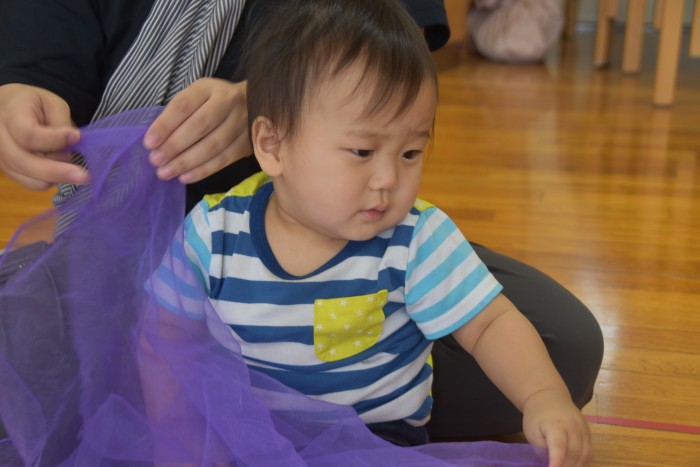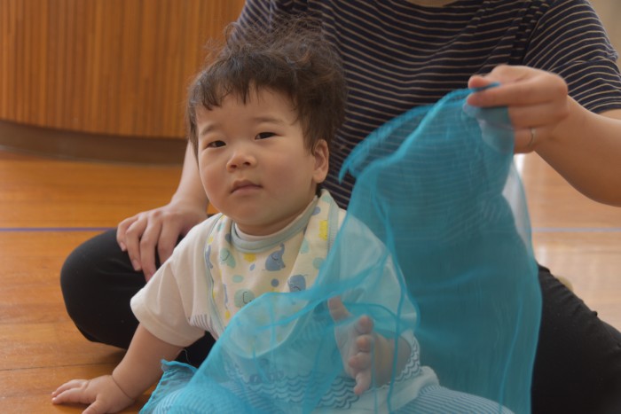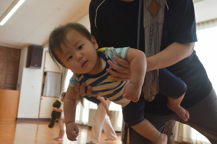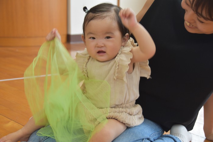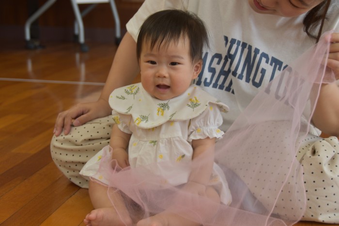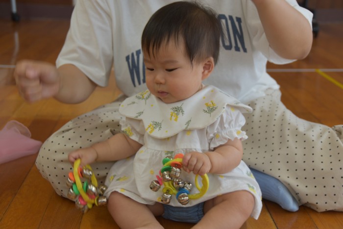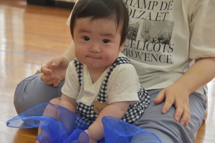 ママと手をつないでみたり、抱っこしてもらいながらリトミックスタート!!