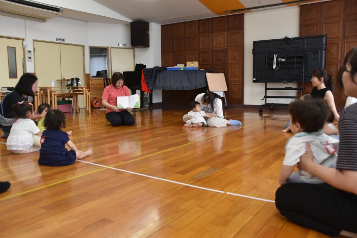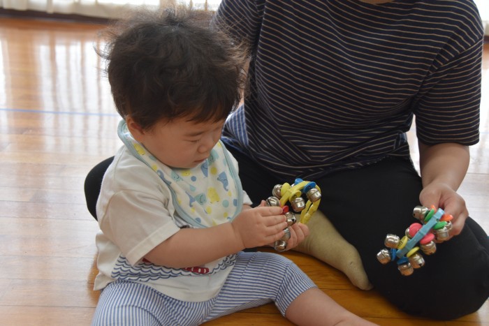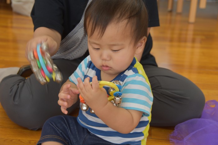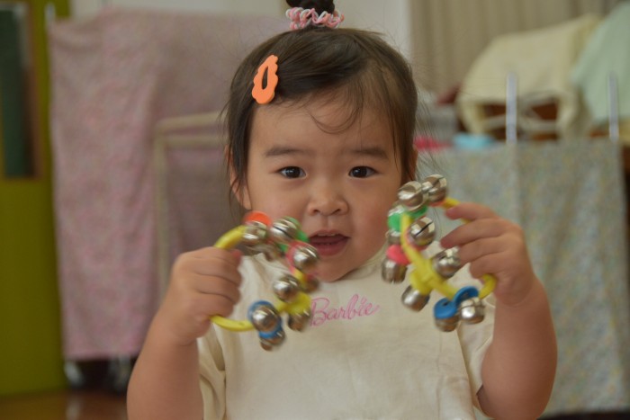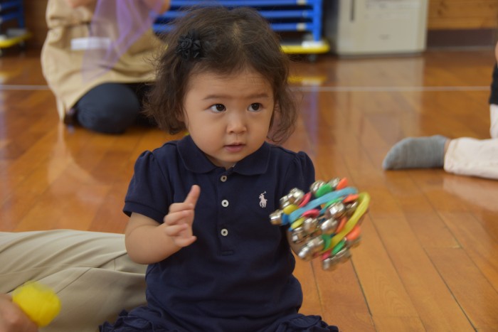 カエルの絵本を読んでもらって、かえるの歌や雨の歌に合わせてゴースと鈴をフリフリ~♪