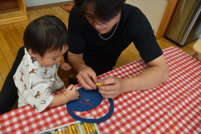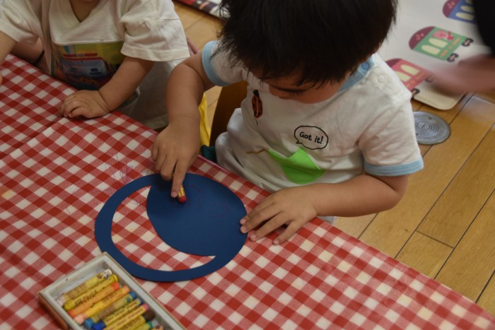 クレヨンで模様を描いて、キラキラシールをペッタン