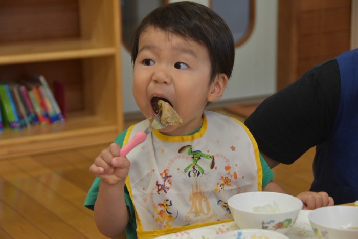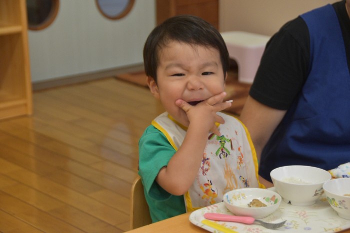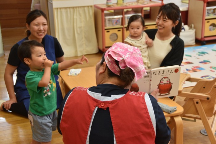 給食の前には、みんなが大好きな「だるまさんが」の絵本を読んでだるまさんの真似っこ(^o^)