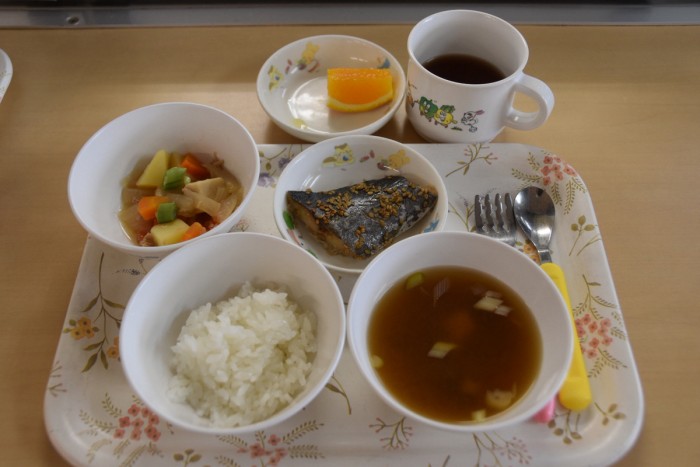 ・ご飯 ・味噌汁 ・さわらのごま焼き ・じゃがいもとツナの煮物 ・フルーツ