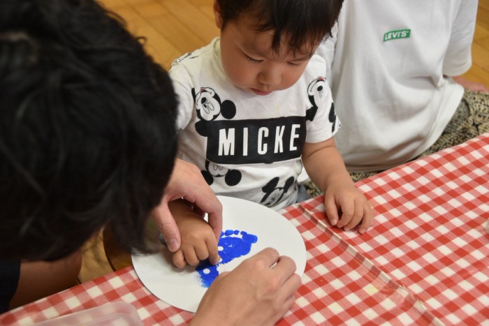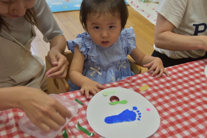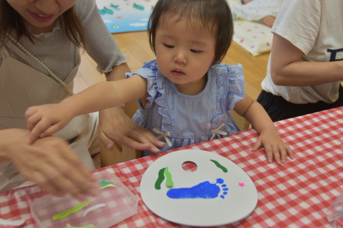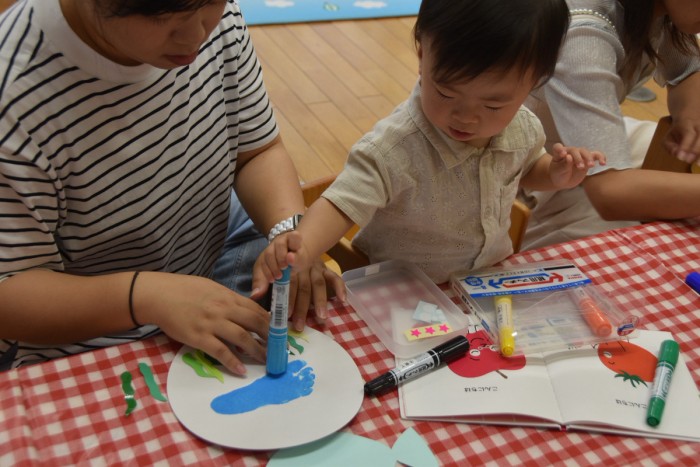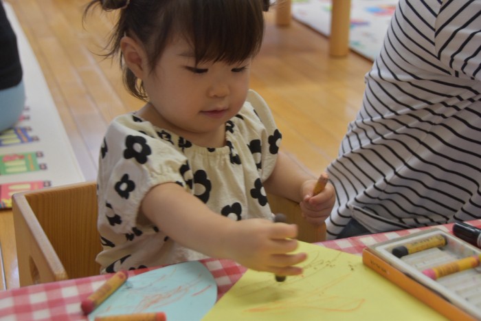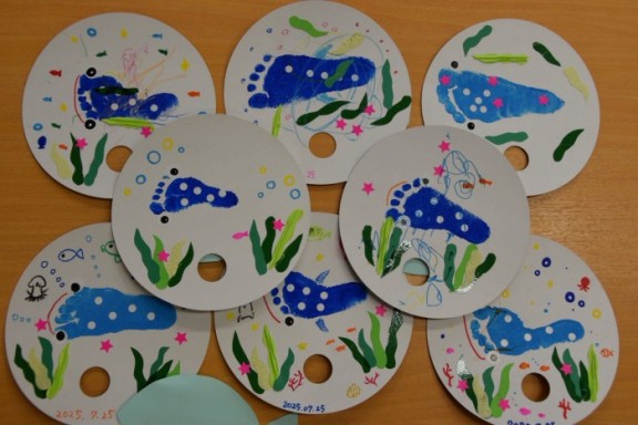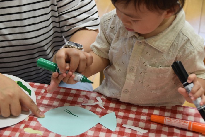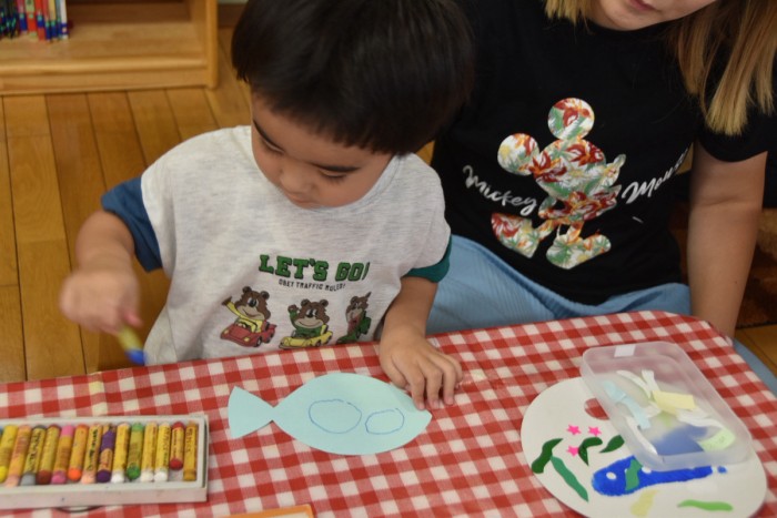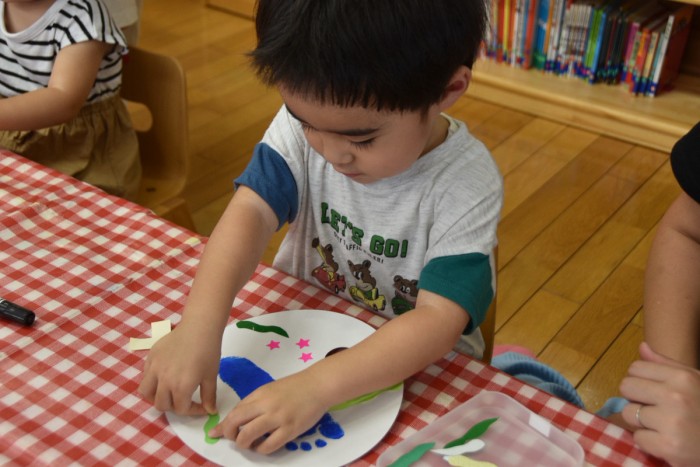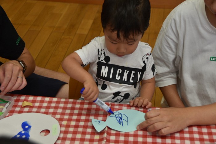ジンベイザメの体にシールで模様を付けたり、お絵かきをしてかわいいジンベイザメが出来ました♡