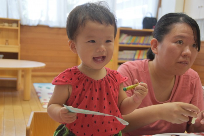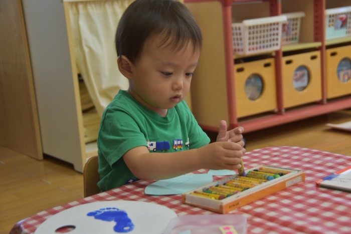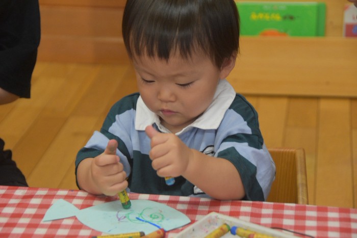シールをペタペタしたり、お魚の形の画用紙にクレヨンでかきかき!