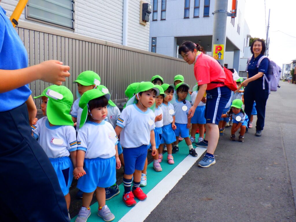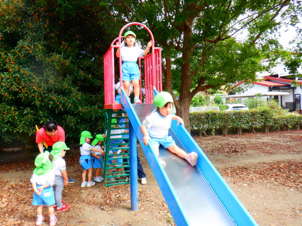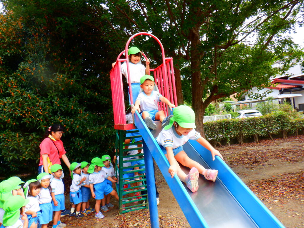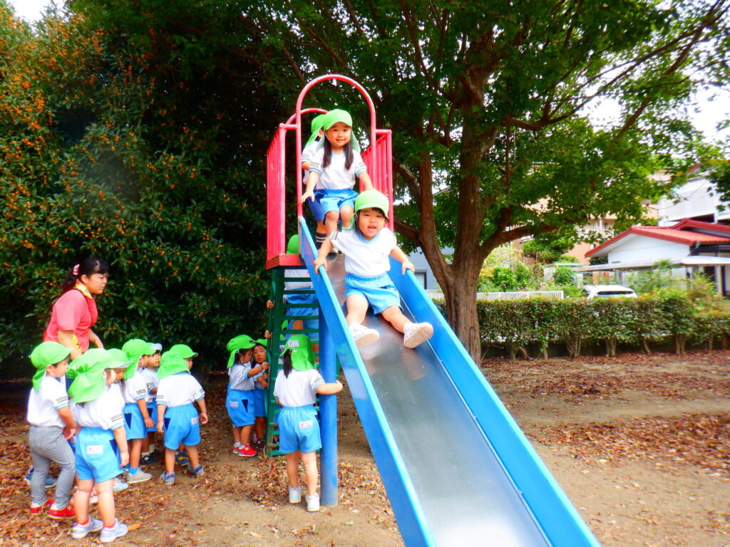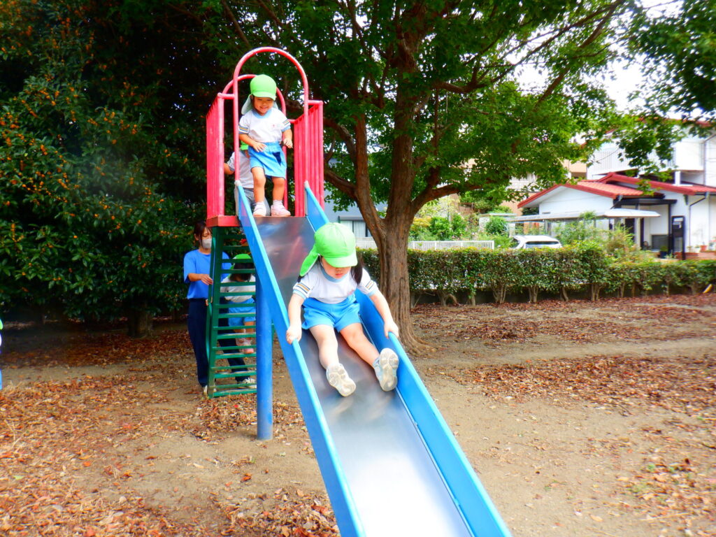 見福公園までお散歩に行きました!「2人組!」とお友達と仲良く手を繋ぎ、お歌を歌いながら一生懸命歩きました。大きいすべり台に大興奮!1人1回ニコニコ笑顔で滑りました😊ヘリコプターの音が聞こえてみんなで空に向かって「やっほー!」と挨拶しました✨