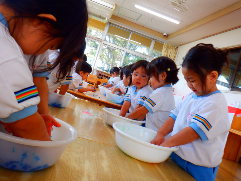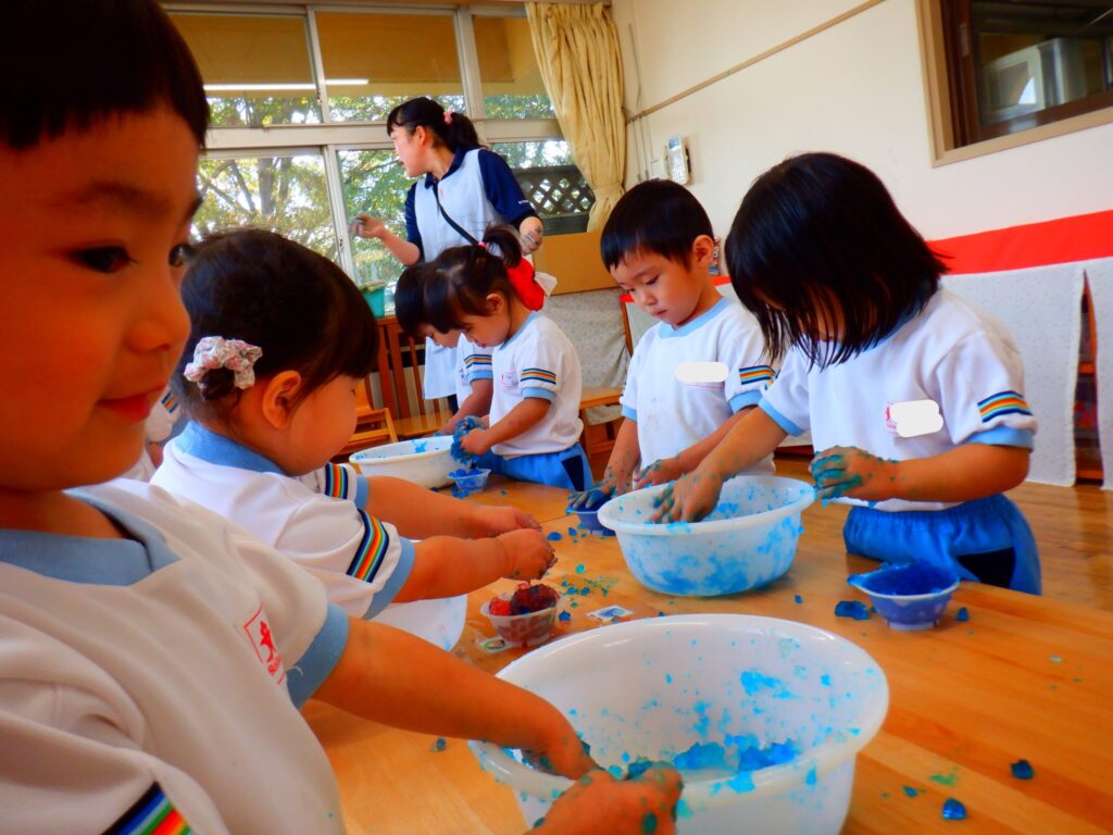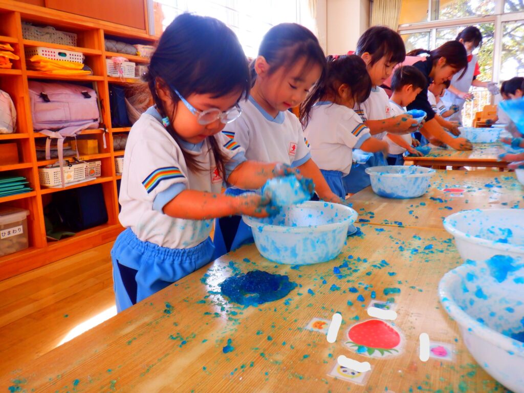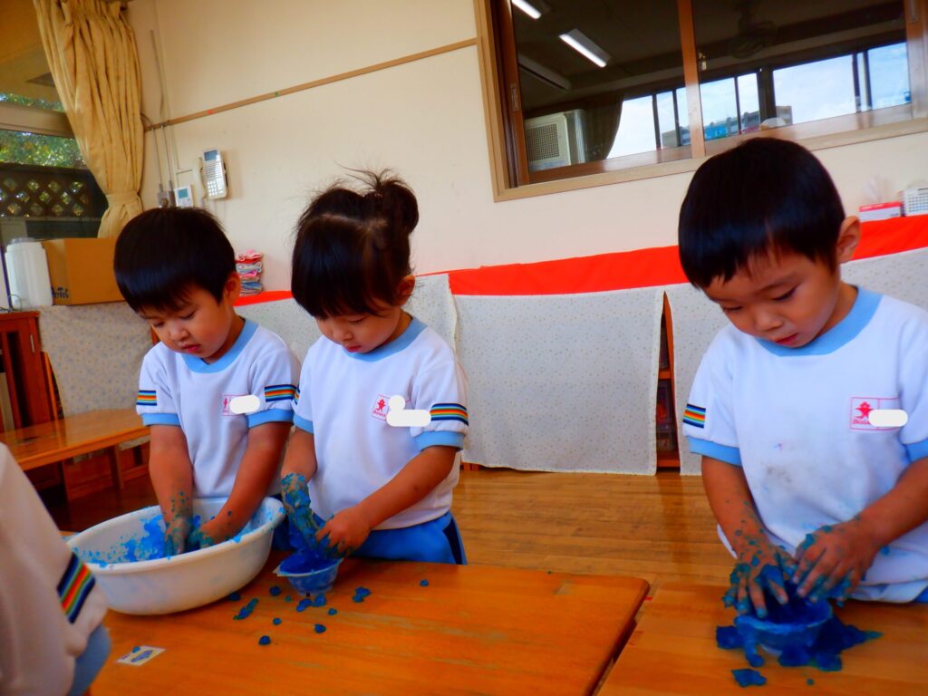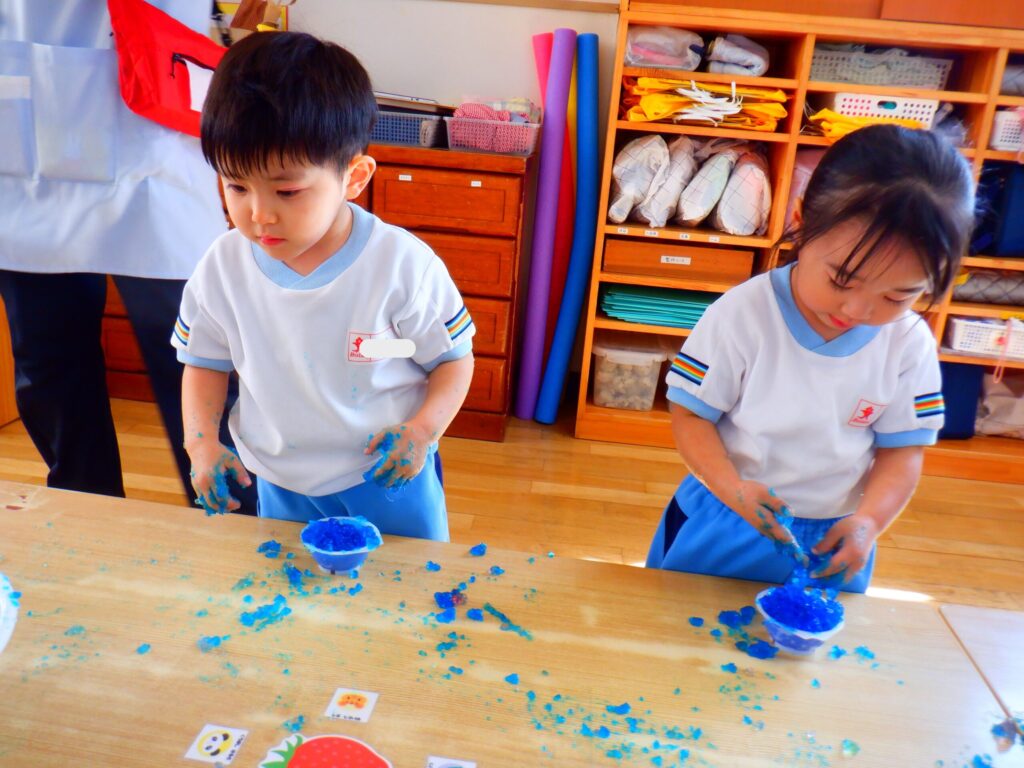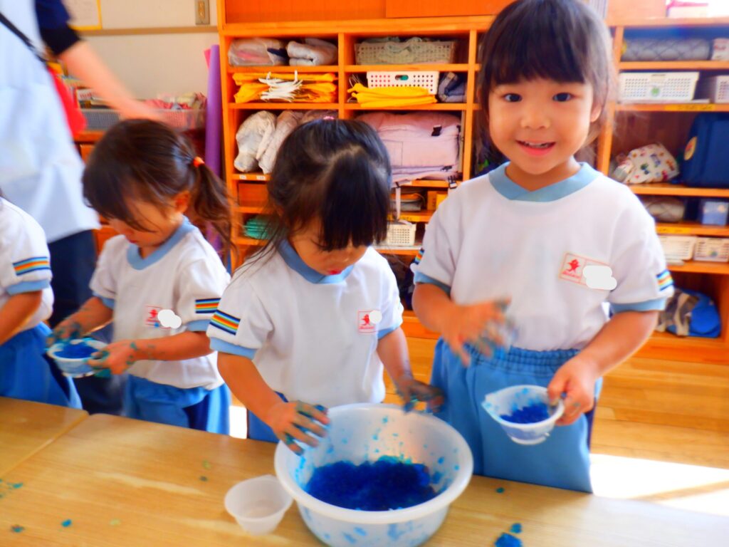 カップを渡してみると、「ゼリー作る!」とたくさん詰めて、「これはブドウ味だよ🍇」「これはみかん味🍊」など好きな味でゼリー屋さんを開いて楽しく遊びました😊