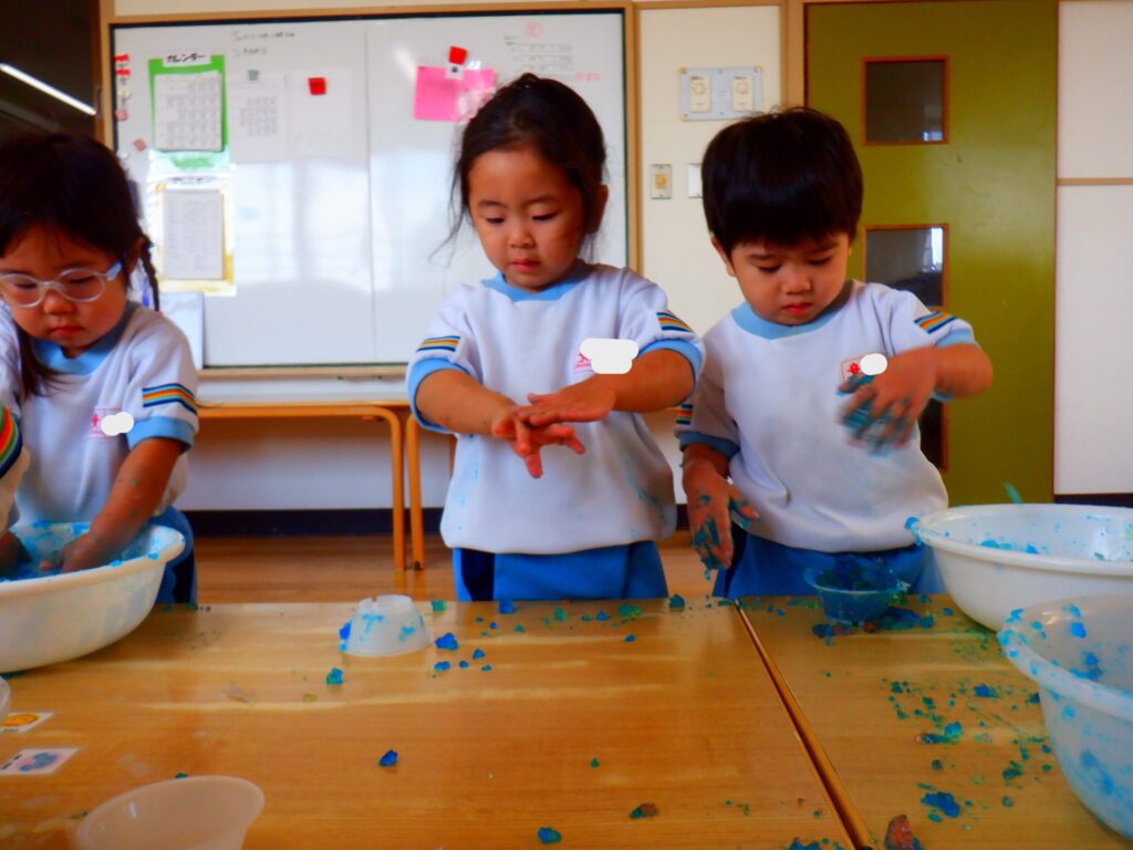 ゼリーで感触遊びをしました。「これなーんだ!」とクイズを出すと「ゼリー!」とわくわくした様子で教えてくれました✨「キラキラだね!」と嬉しそうにしていました。触ってみると「冷たい!」「プルプルしてる!」と言いながら塊がなくなるまでたくさんニギニギと触っていました。